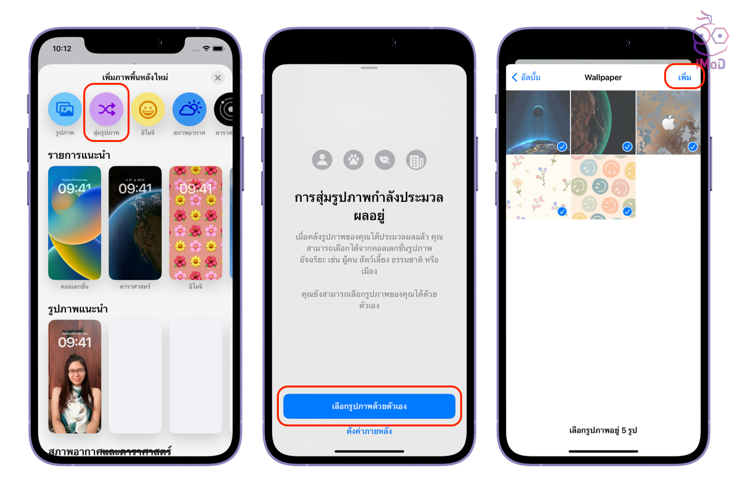 เลือก สุ่มรูปภาพ (Photo Shuffle) > ถ้าหากเรามีภาพพื้นหลังอยู่แล้ว ให้แตะ เปลี่ยนรูปภาพด้วยตัวเอง (Select Photo Manually) > เลือกรูปภาพที่ต้องการในอัลบั้ม แล้วแตะเพิ่ม (Add)