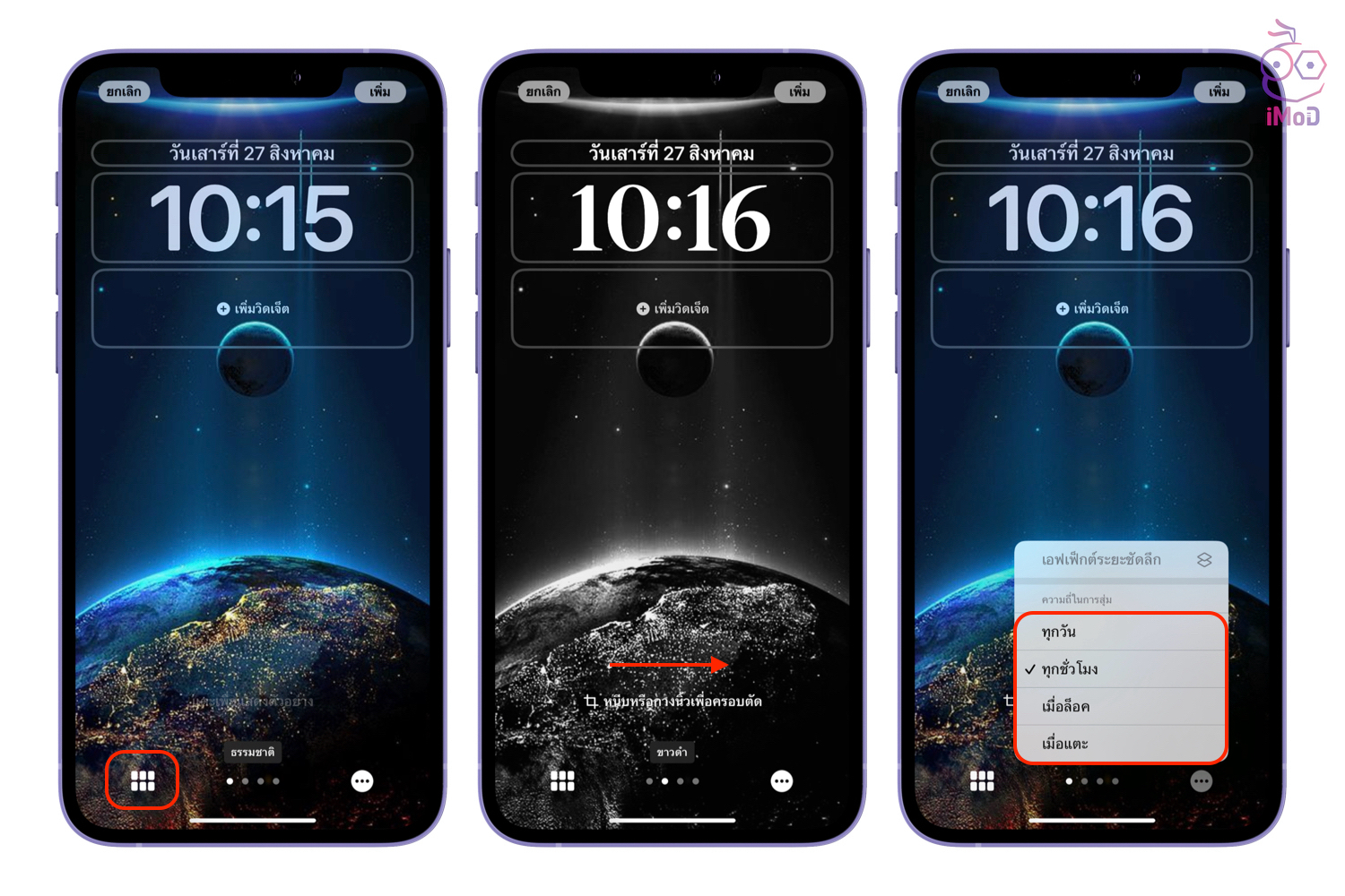 สามารถปรับแต่งวิดเจ็ตหน้าจอล็อคได้ แตะไอคอนสี่เหลี่ยมมุมล่างขวา เพื่อดูตัวอย่างพื้นหลังอื่น ๆ ที่เลือกมา > สามารถปัดไปทางขวาเพื่อเลือกเอฟเฟกต์การแสดงผลรูปภาพ > แล้วแตะไอคอน 3 จุดมุมด้านล่างซ้าย เพื่อเลือกความถี่ในการสุ่มแสดงผลภาพหน้าจอ