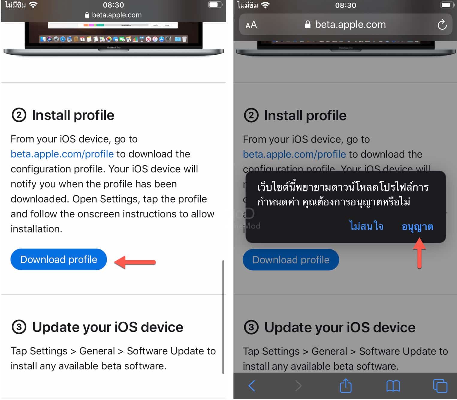 แตะปุ่ม “Download profile” > แตะ “อนุญาต” (Allow)