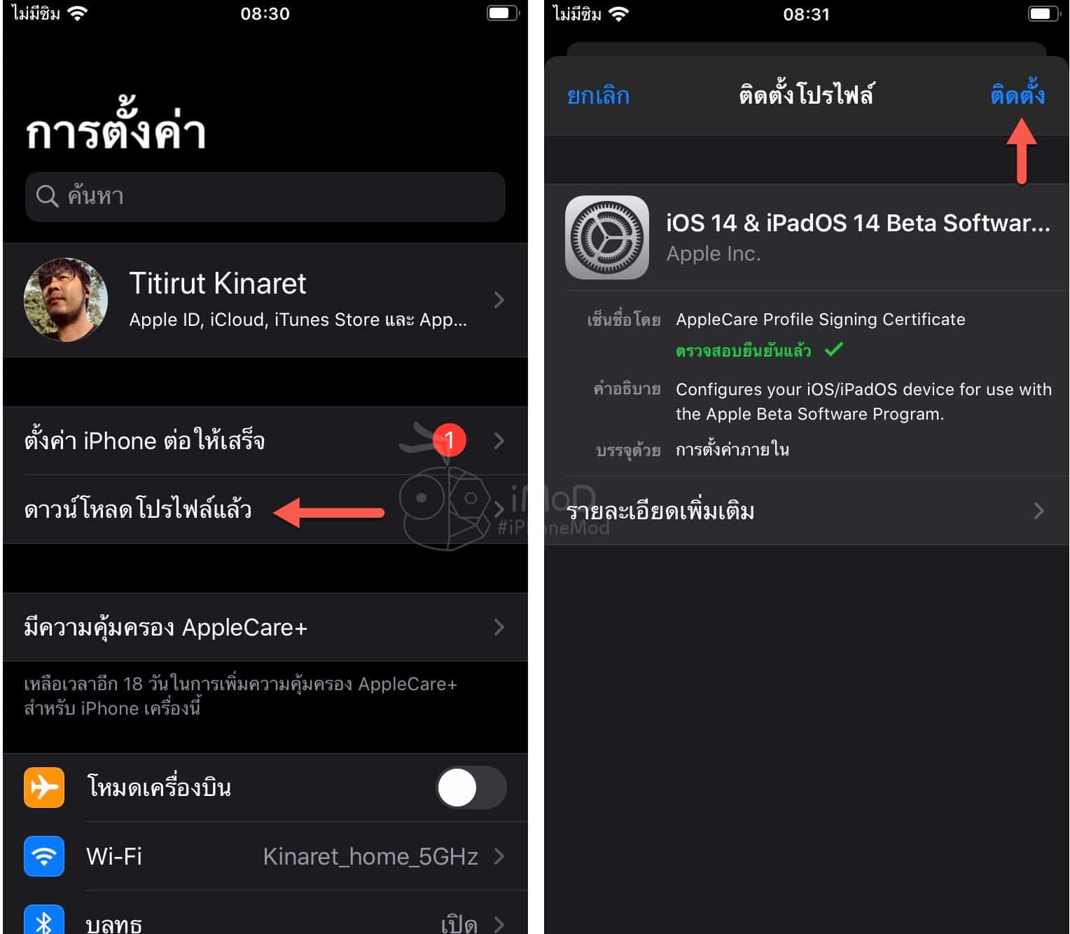 ไปที่การตั้งค่า (Settings) ก็จะเห็น “ดาวน์โหลดโปรไฟล์แล้ว” ให้แตะเข้าไปได้เลยแล้วแตะ “ติดตั้ง” (Install)