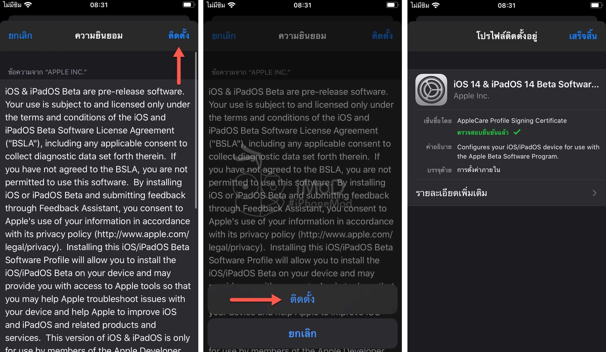 ถ้าไม่มีให้ไปที่ ทั่วไป (General) > โปรไฟล์ (Profile) > แตะ iOS 14 & iPadOS 14 Beta Software