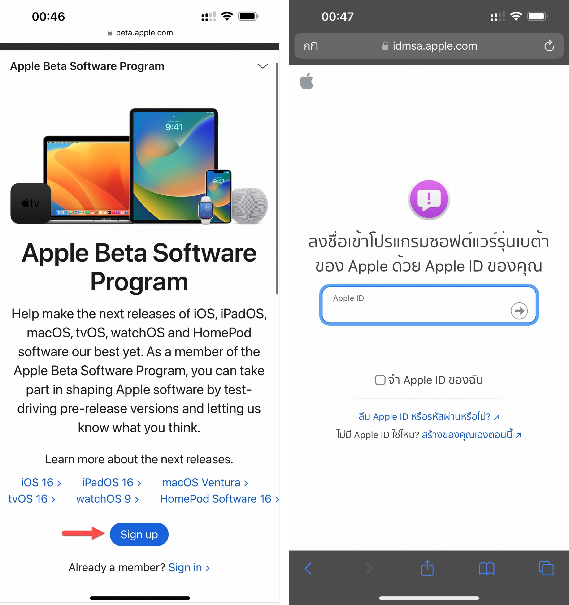 ไปที่เว็บไซต์ https://beta.apple.com (เปิดด้วยแอป Safari) > แตะปุ่ม Sign Up (เลื่อนลงมากลางจอ) หรือ Sign in (หากเคยลงทะเบียนไปแล้ว) > กรอก Apple ID ของเราให้เรียบร้อย