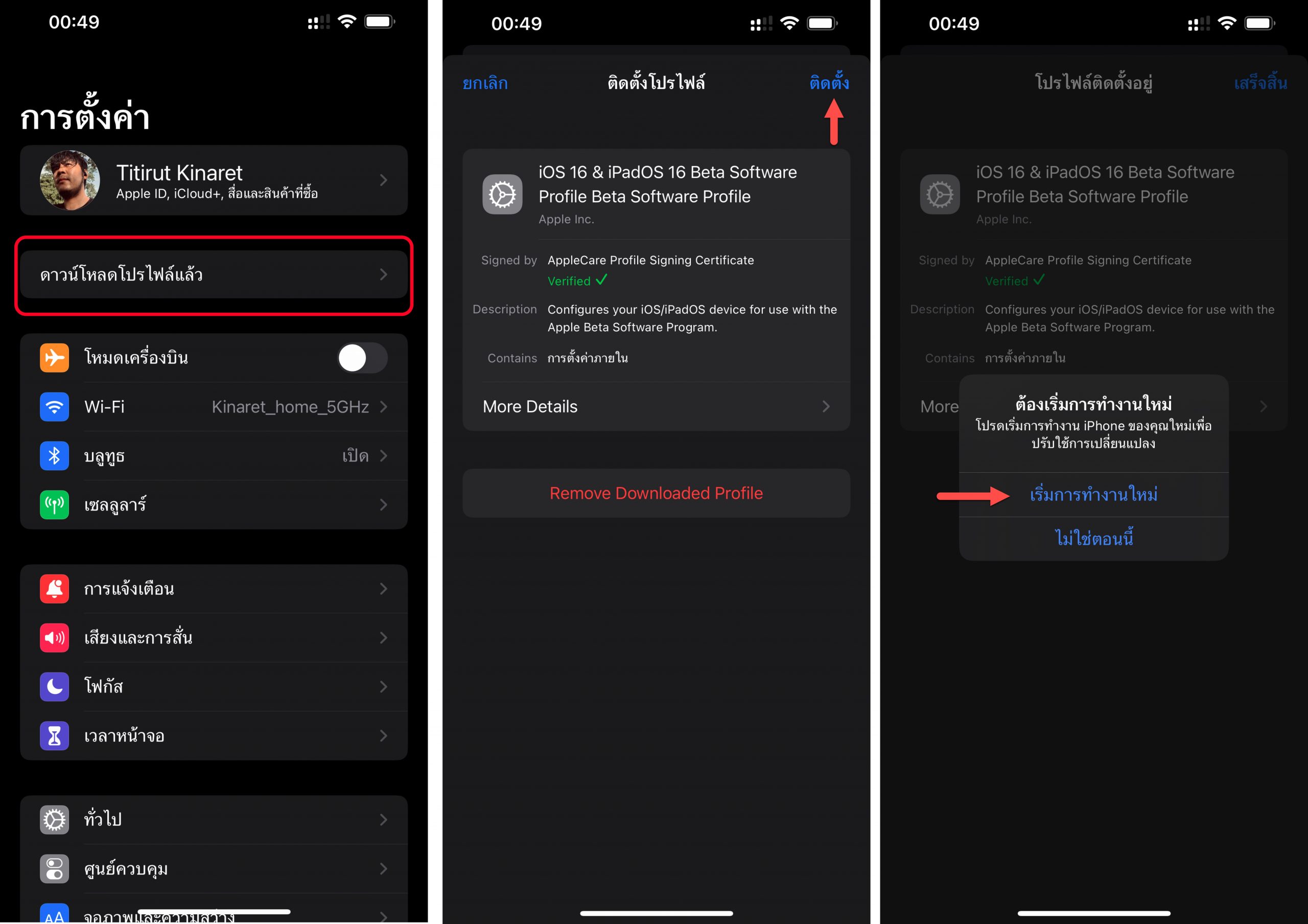 ไปที่การตั้งค่า (Settings) ก็จะเห็น “ดาวน์โหลดโปรไฟล์แล้ว” ให้แตะเข้าไปได้เลยแล้วแตะ “ติดตั้ง” (Install)