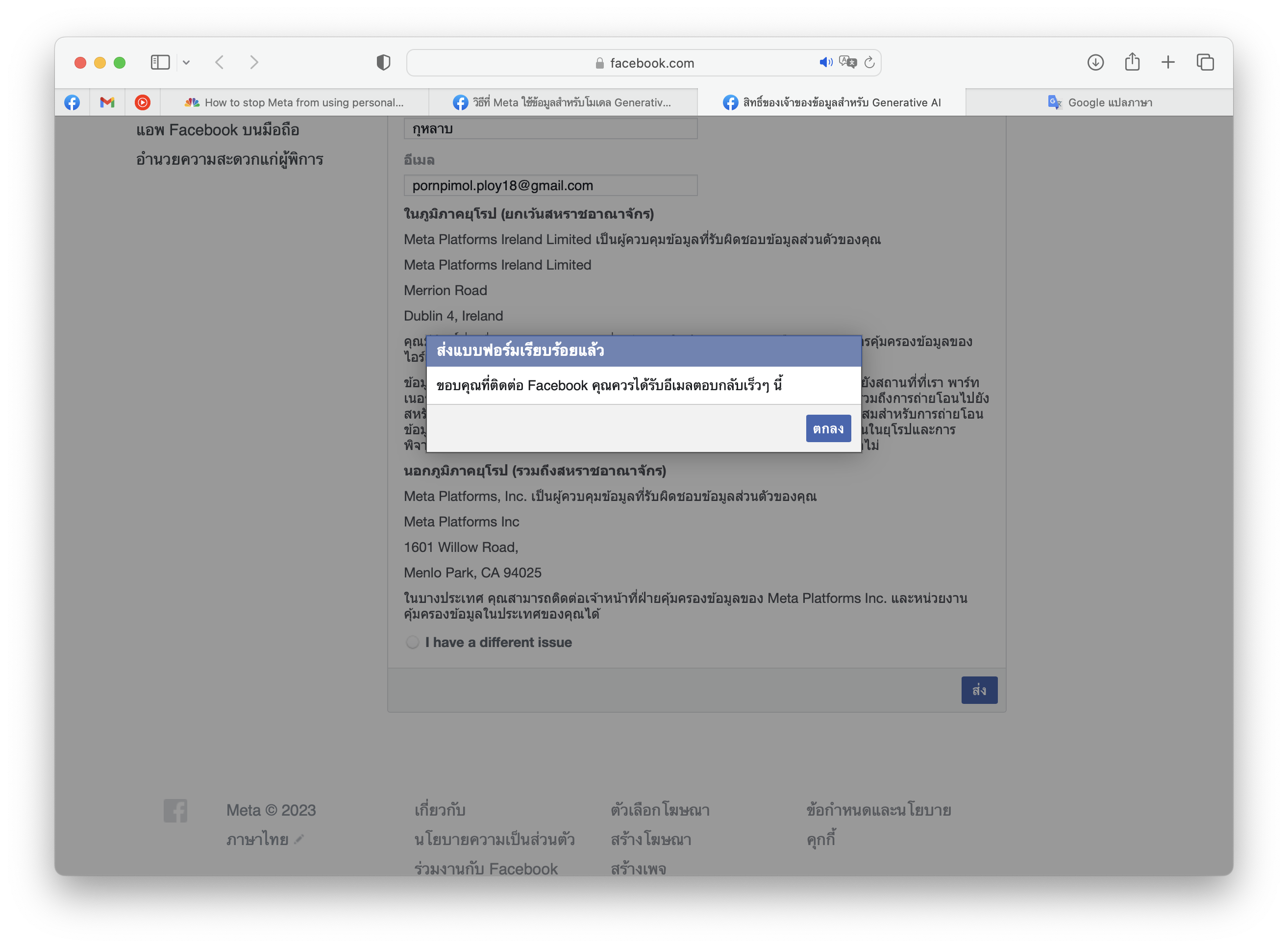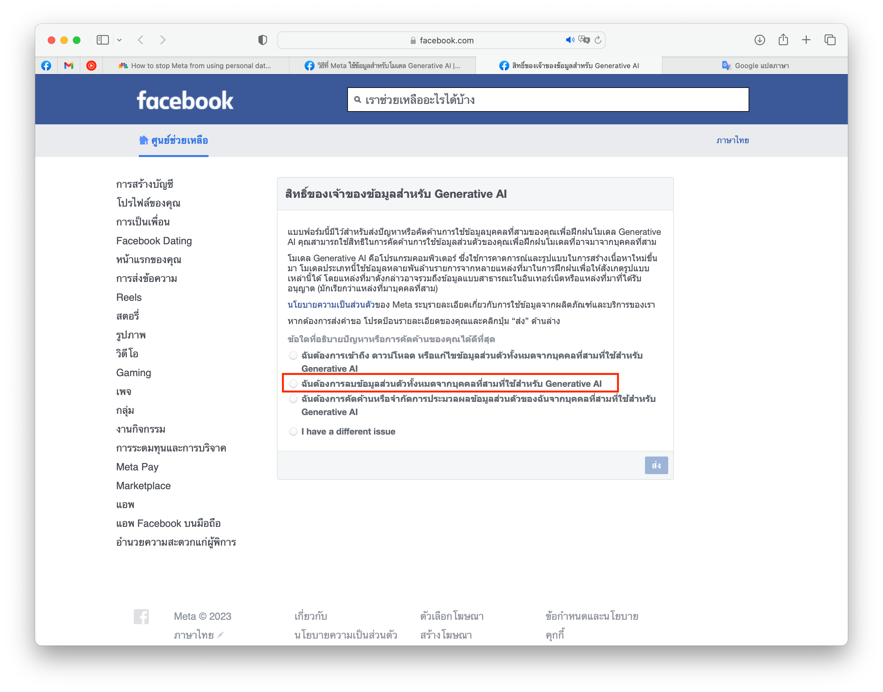 • ข้อ 2 ขอลบข้อมูลส่วนตัวทั้งหมดที่ Meta ดึงมาจากแหล่งอื่นที่นำไปใช้สอน generative AI