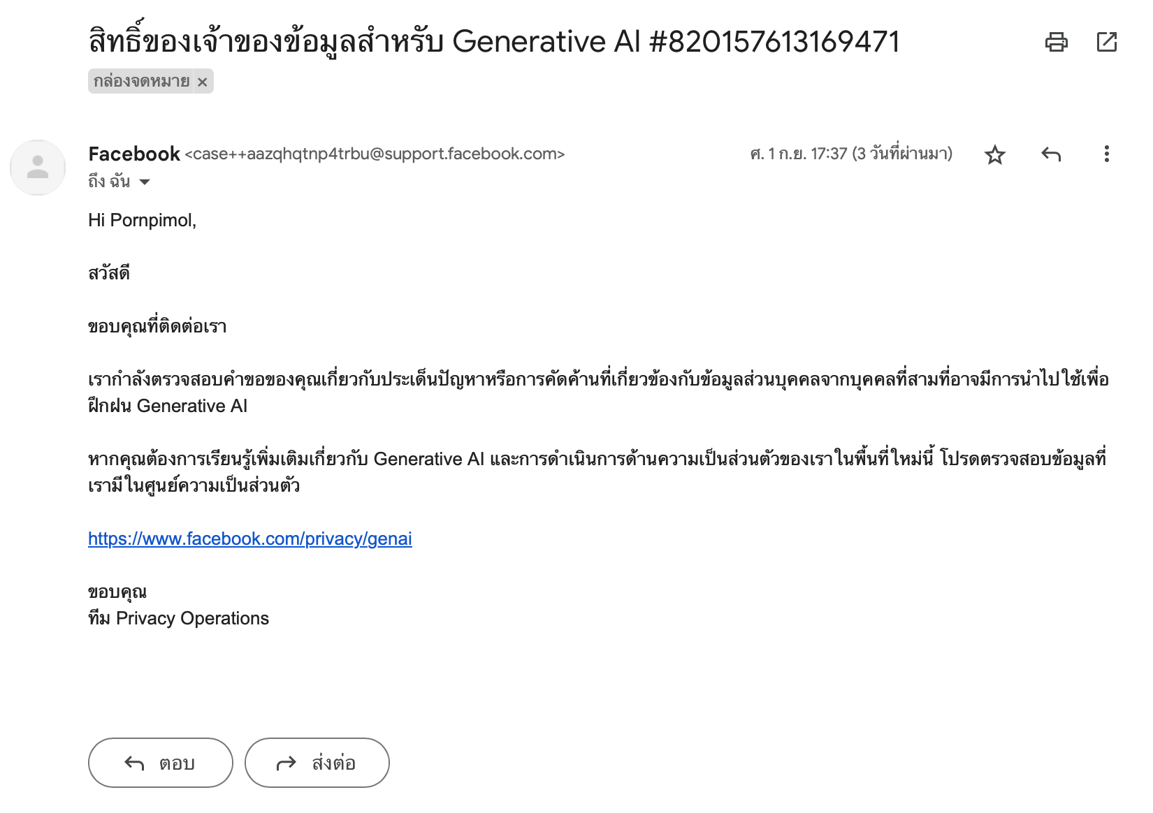 หลังจากมีประเด็นเรื่องที่ Meta จะนำข้อมูลส่วนตัวของผู้ใช้ไปสอน Generative AI โดยไม่ได้รับอนุญาต หากผู้ใช้ไม่มีการทำ Action อะไร จะถือเป็นการยินยอมให้ Meta นำข้อมูลไปใช้เลย