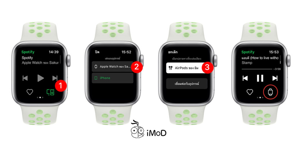 เพียงแค่เปิดแอป Spotify ขึ้นมา จากนั้นไปยังหน้าจอเล่นเพลง > แตะเลือกไอคอนอุปกรณ์ > แตะเลือก Apple Watch (หากไม่ได้เชื่อมต่อหูฟัง ก็เชื่อมต่อใหเรียบร้อยดังข้อ 3) เมื่อเชื่อมต่อแล้ว หน้าเล่นเพลงก็จะแสดงไอคอน Apple Watch