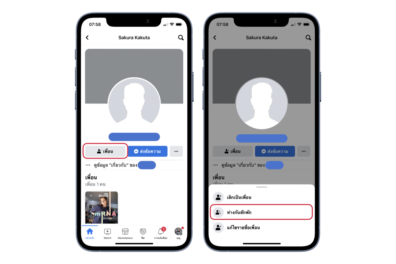 ไปที่โปรไฟล์ของเพื่อน แล้วแตะ เพื่อน (Friend) > แตะ ห่างกันสักพัก (Take a Break)