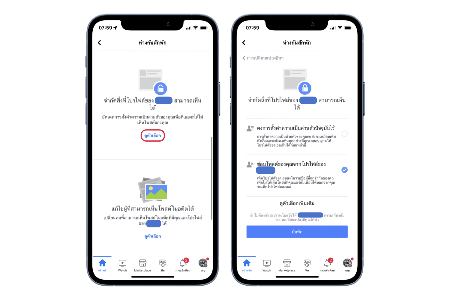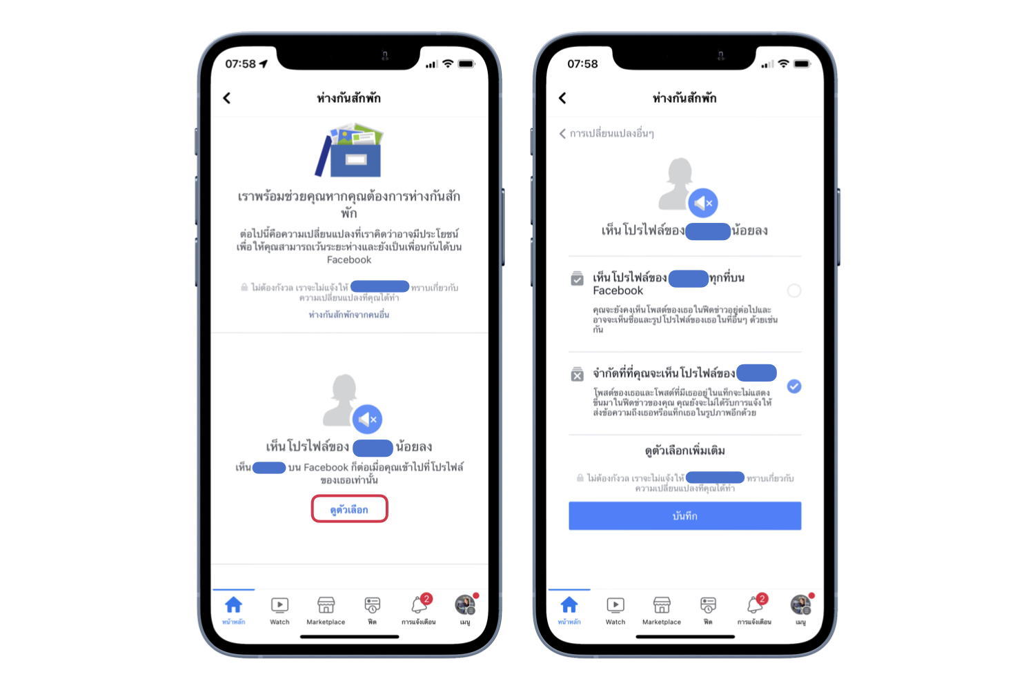 ส่วนของการดูโปรไฟล์ ให้แตะ ดูตัวเลือก > เลือกจำกัดการเห็นโปรไฟล์ของเพื่อน โดยเราจะไม่ได้รับการแจ้งเตือนเกี่ยวกับโปรไฟล์ของเพื่อน ไม่เห็นการถูกแท็กของเพื่อนบนฟีด