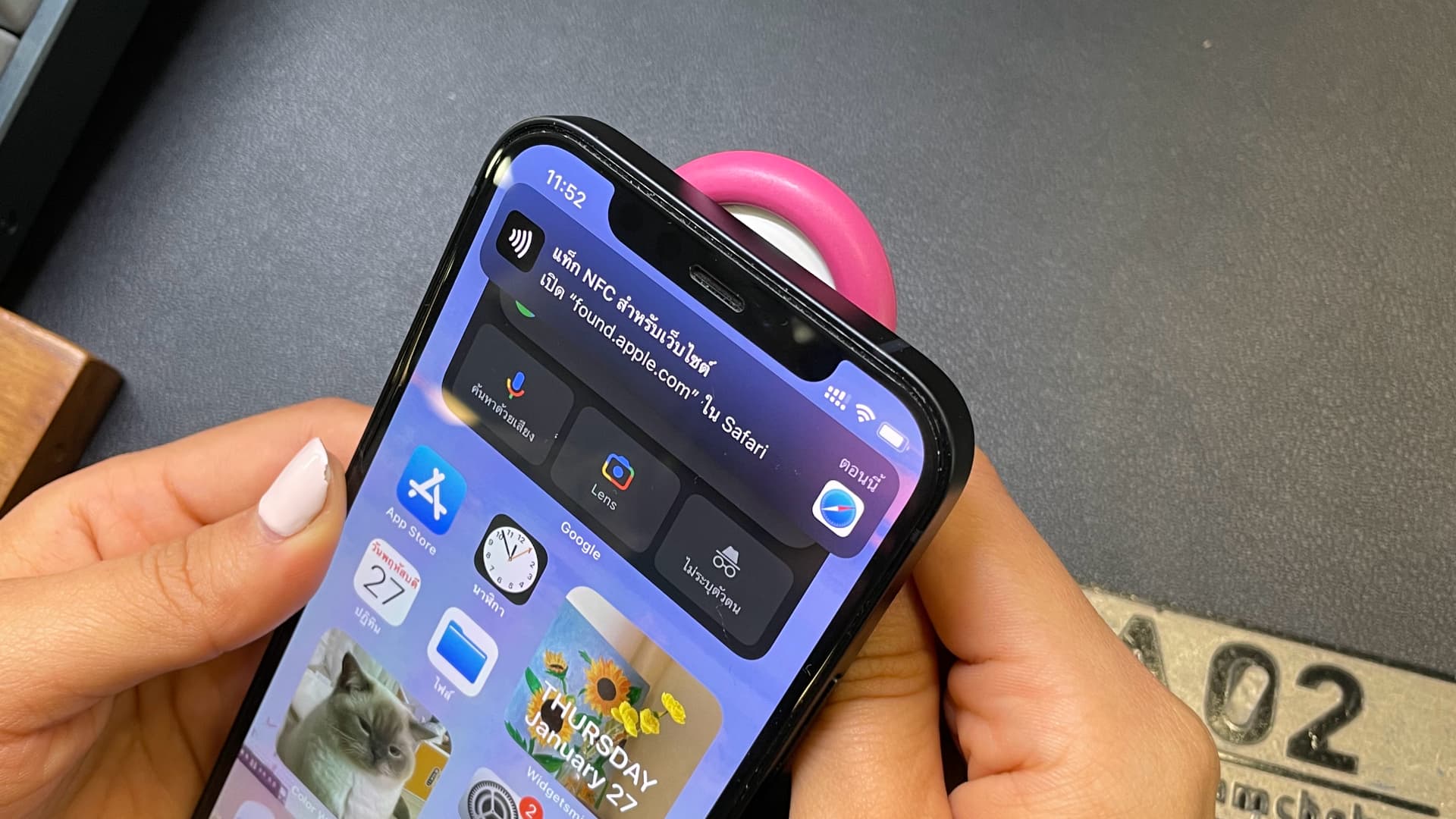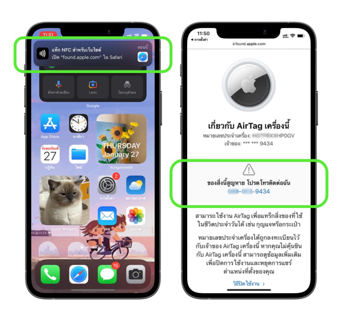 เมื่อนำไปแตะจะมีหน้าต่างเล็ก ๆ เด้งขึ้นมาที่ด้านบน ที่เขียนว่า “แท็ก NFC สำหรับเว็บไซต์” ให้แตะเข้าไปเลย > จากนั้นจะมีข้อมูลการติดต่อเจ้าของ AirTag ไว้ให้เราใช้ติดต่อเจ้าของได้