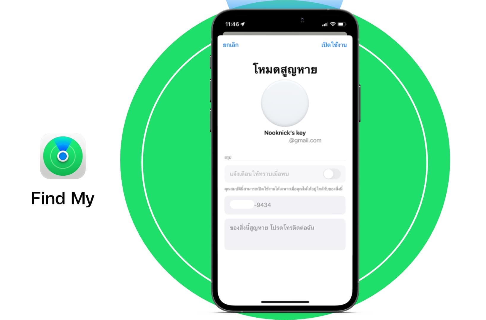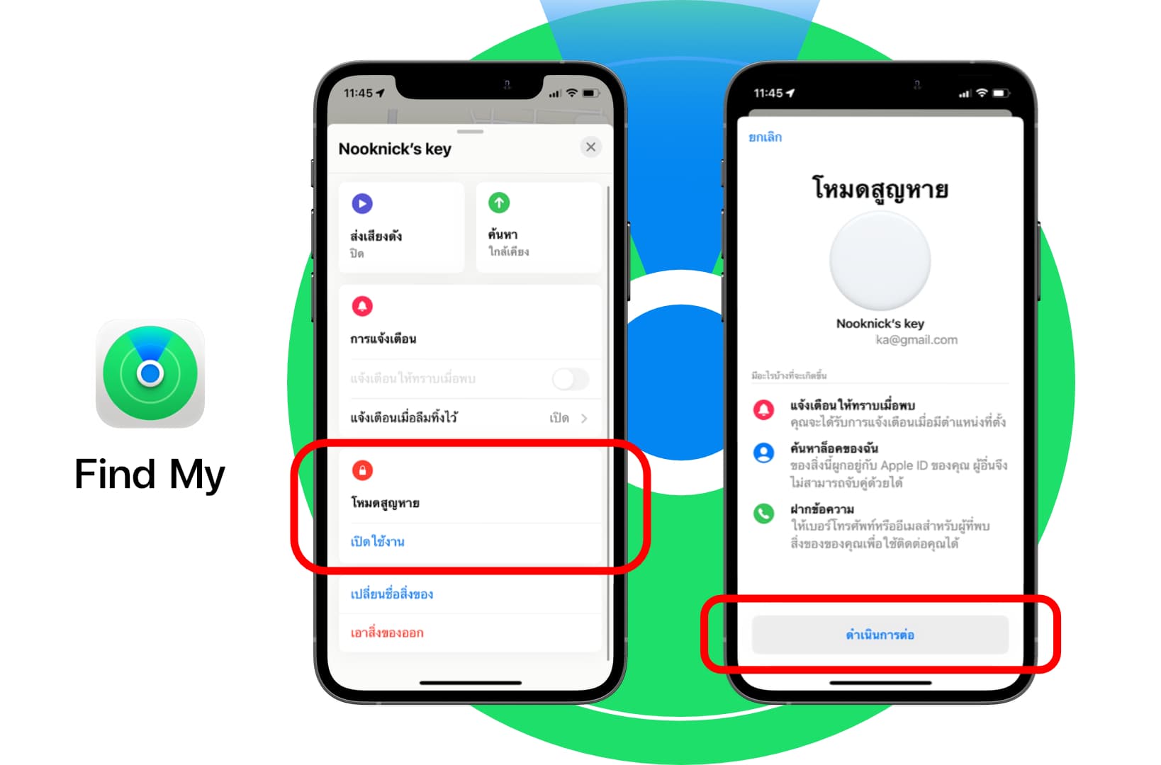 เข้าไปที่แอป Find My > แตะที่ AirTag > เปิดใช้งานโหมดสูญหาย > ดำเนินการต่อ