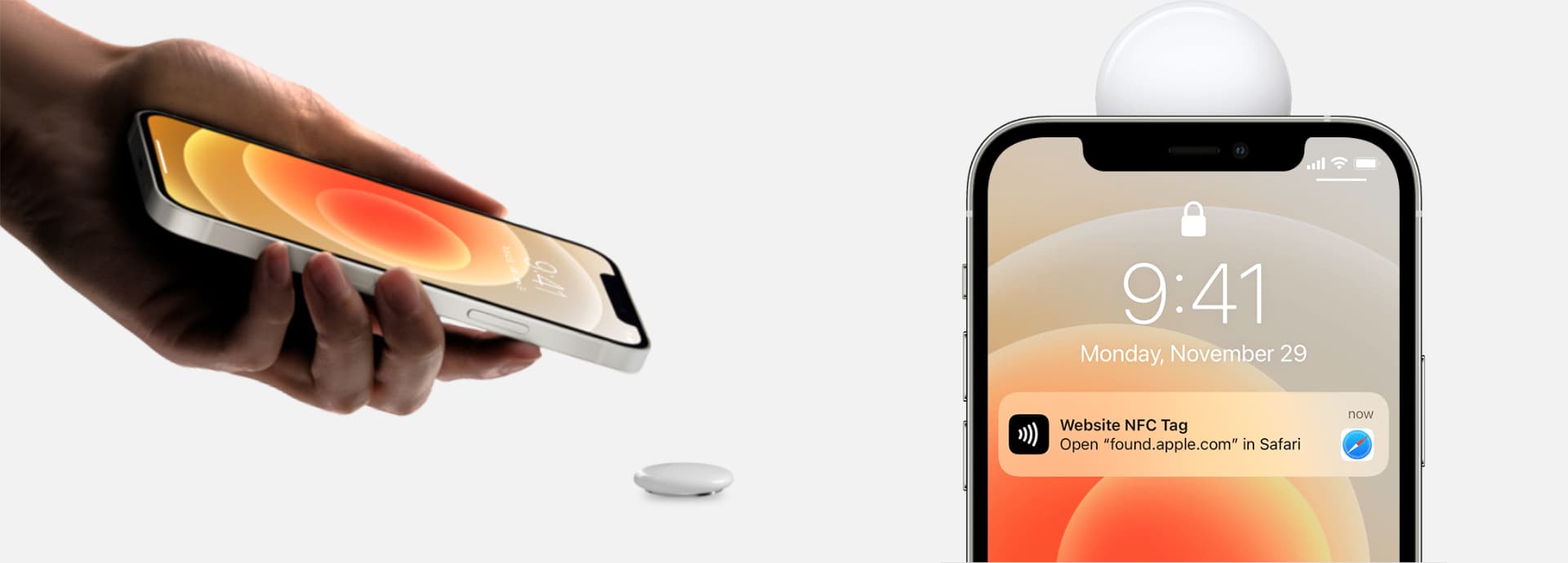 นำสมาร์ตโฟนที่รองรับ NFC ไปแตะที่บริเวณด้านหลังของ AirTag (ฝั่งที่เป็นสีขาว) โดย NFC ของ iPhone ส่วนใหญ่จะอยู่ที่ด้านหลังเครื่องส่วนบนดังรูปด้านล่าง