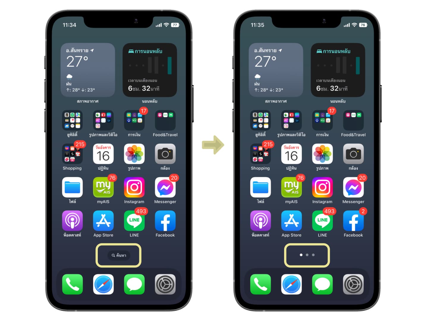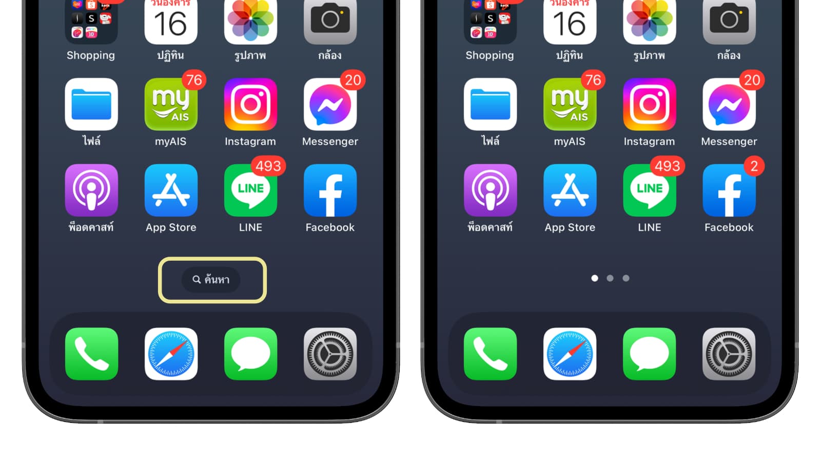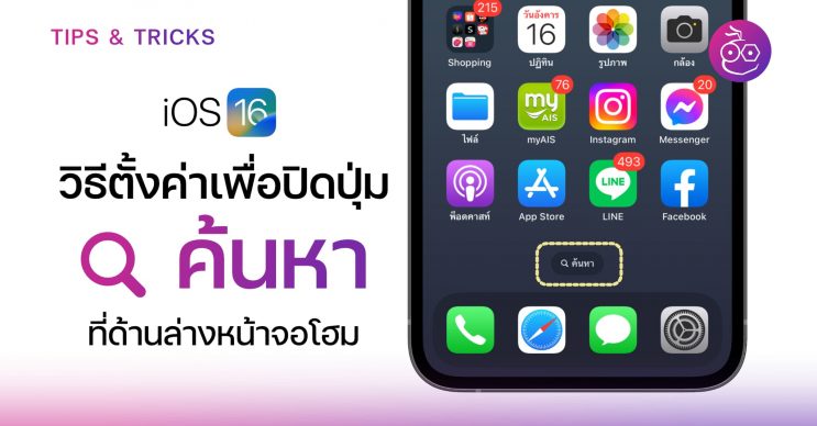 ปุ่ม “ค้นหา” ทำหน้าที่การค้นหาเหมือนกับเมนู Spotlight Search หากอยากปิดปุ่มนี้ไม่ให้แสดงที่หน้าจอโฮม มาดูวิธีกันเลย