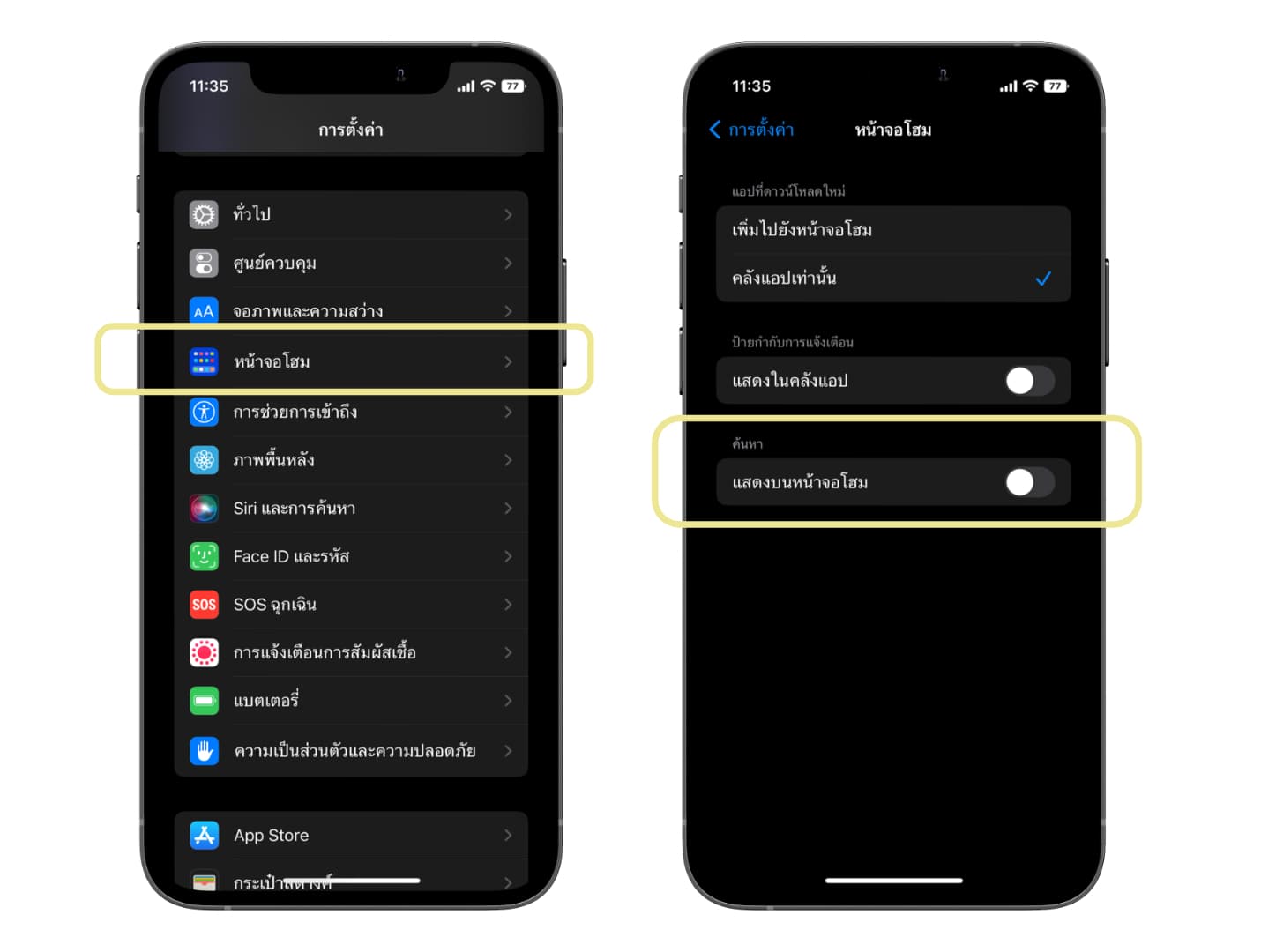 เข้าไปที่การตั้งค่า > หน้าจอโฮม > ปิด “แสดงบนหน้าจอโฮม” ที่เมนูค้นหา