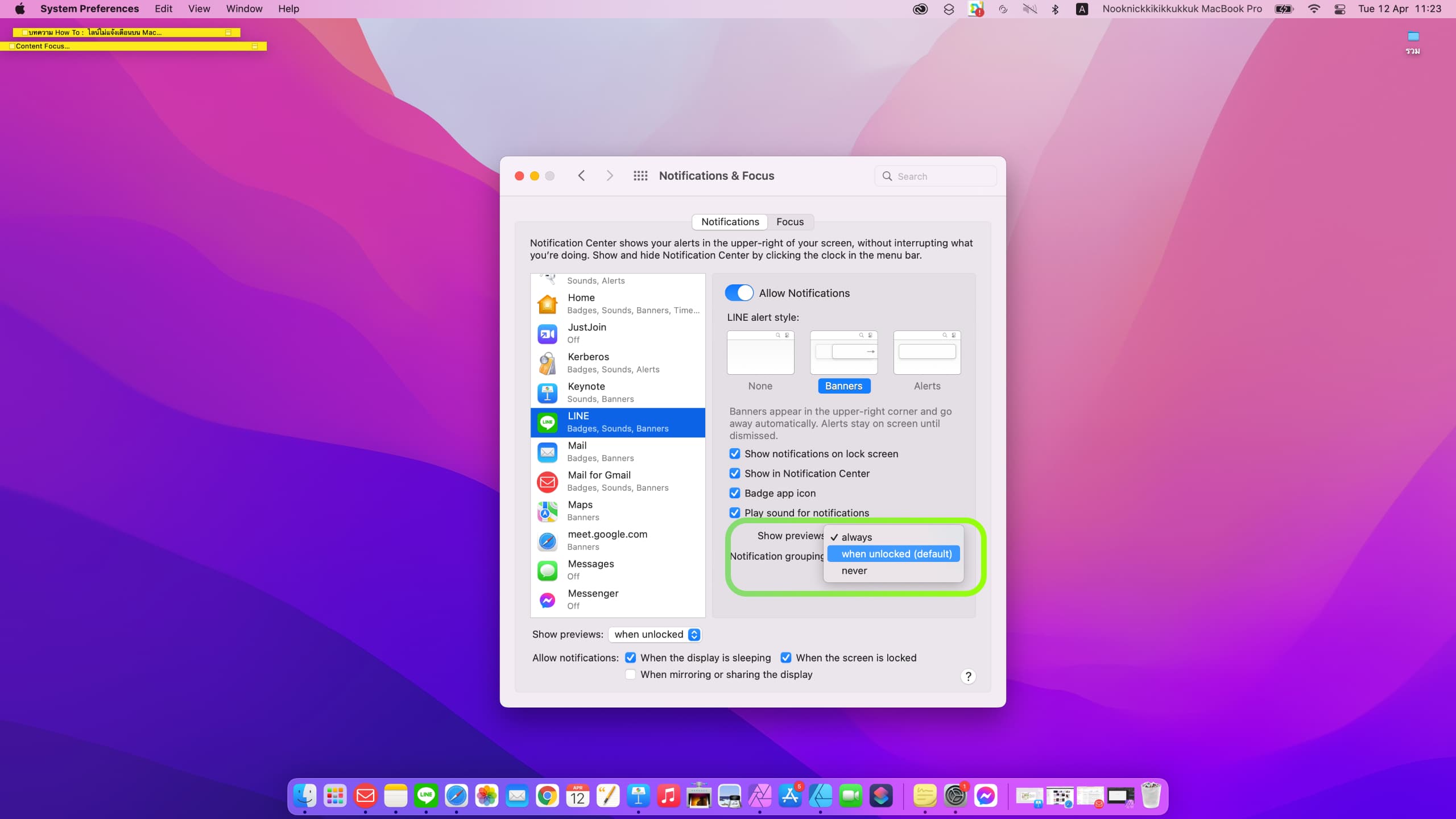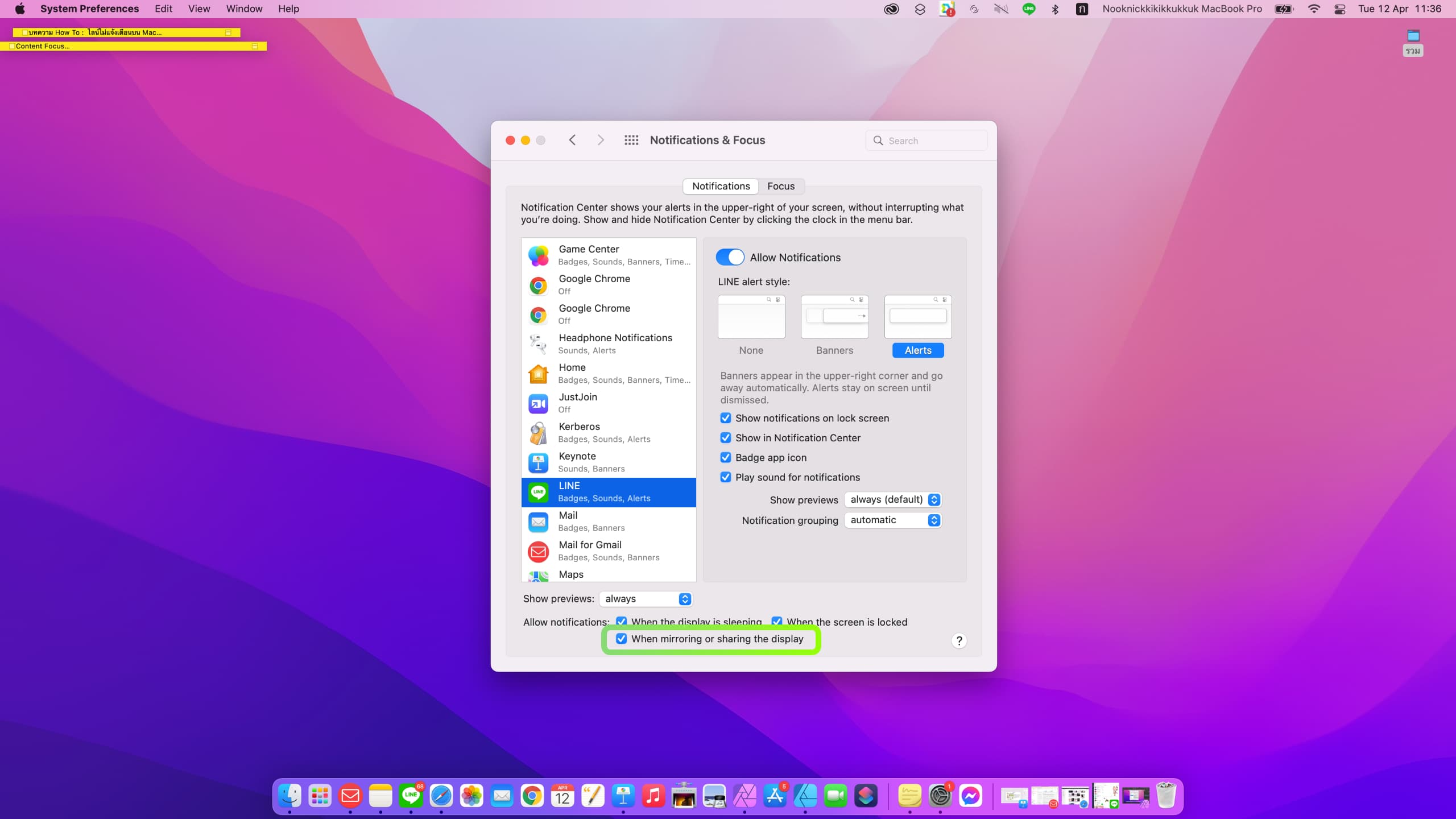 5. หากต่อ Mac กับจอนอก การแจ้งเตือนจาก LINE จะไม่แสดงขึ้นมาที่หน้าจอ ให้เราทำเครื่องหมาย ✓ หน้าคำว่า When mirroring or sharing the display เพื่ออนุญาติการแสดงการแจ้งเตือนจาก LINE ในเวลาที่เราใช้จอเสริม