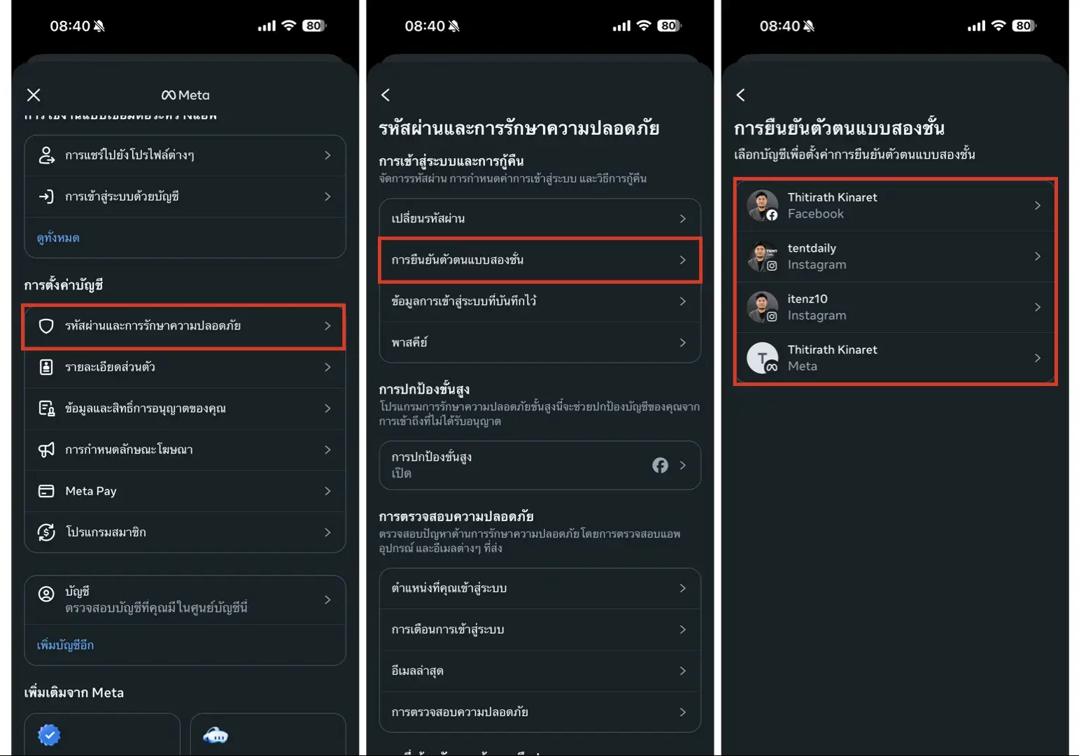 แตะ รหัสผ่านและการรักษาความปลอดภัย > แตะ การยืนยันตัวตนแบบสองชั้น > เลือกบัญชีที่ต้องการเปิดใช้งานการยืนยันตัวตนแบบสองชั้น