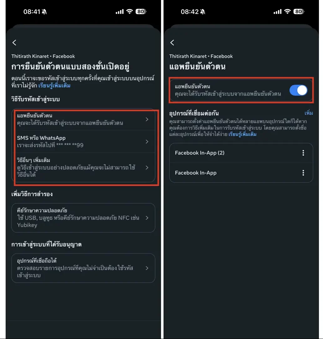 การยืนยันตัวตนแบบสองชั้น แนะนำให้เปิดทั้ง 2 วิธี หากเปิดการยืนยันด้วยแอป เมื่อทำการล็อคอินเข้าสู่ระบบใหม่ ผู้ใช้จะต้องกดยืนยันตัวตนที่อุปกรณ์อื่น