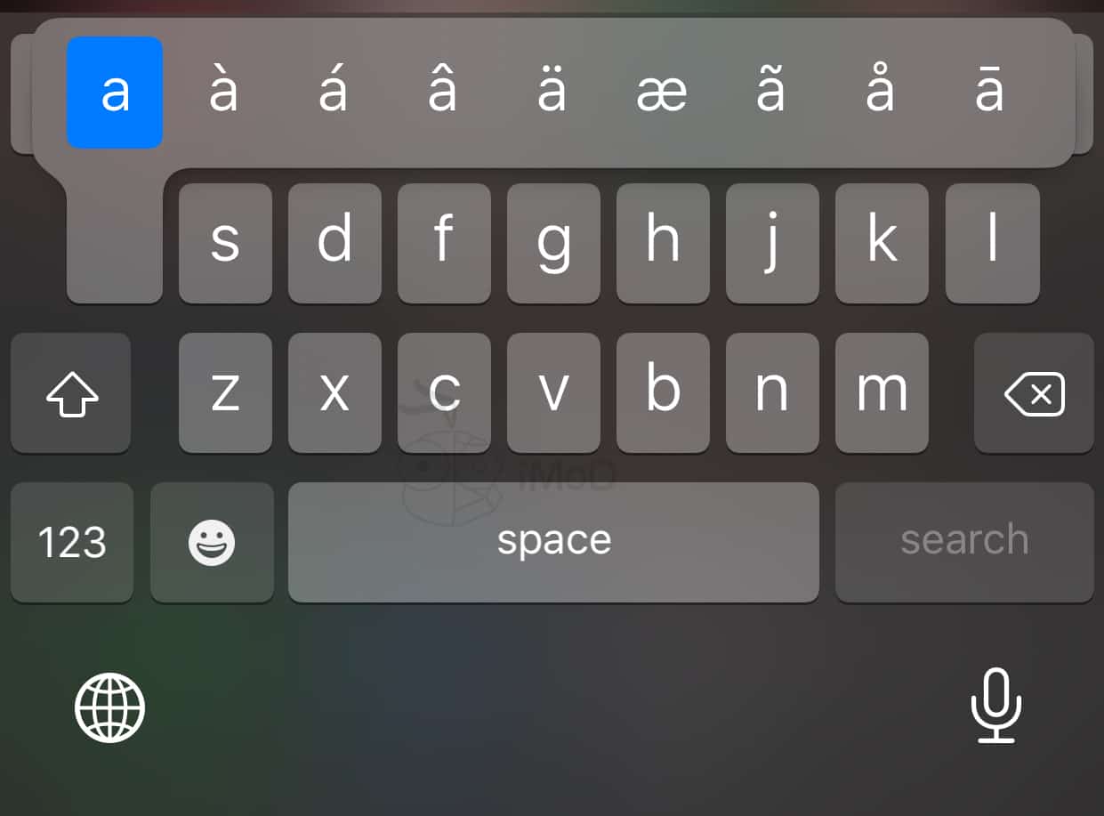 ปุ่มบนคีย์บอร์ด iPhone บางปุ่มนั้นผู้ใช้สามารถแตะค้างเพื่อเลือกอักษรเพิ่มเติมได้ เช่น o a เป็นต้น