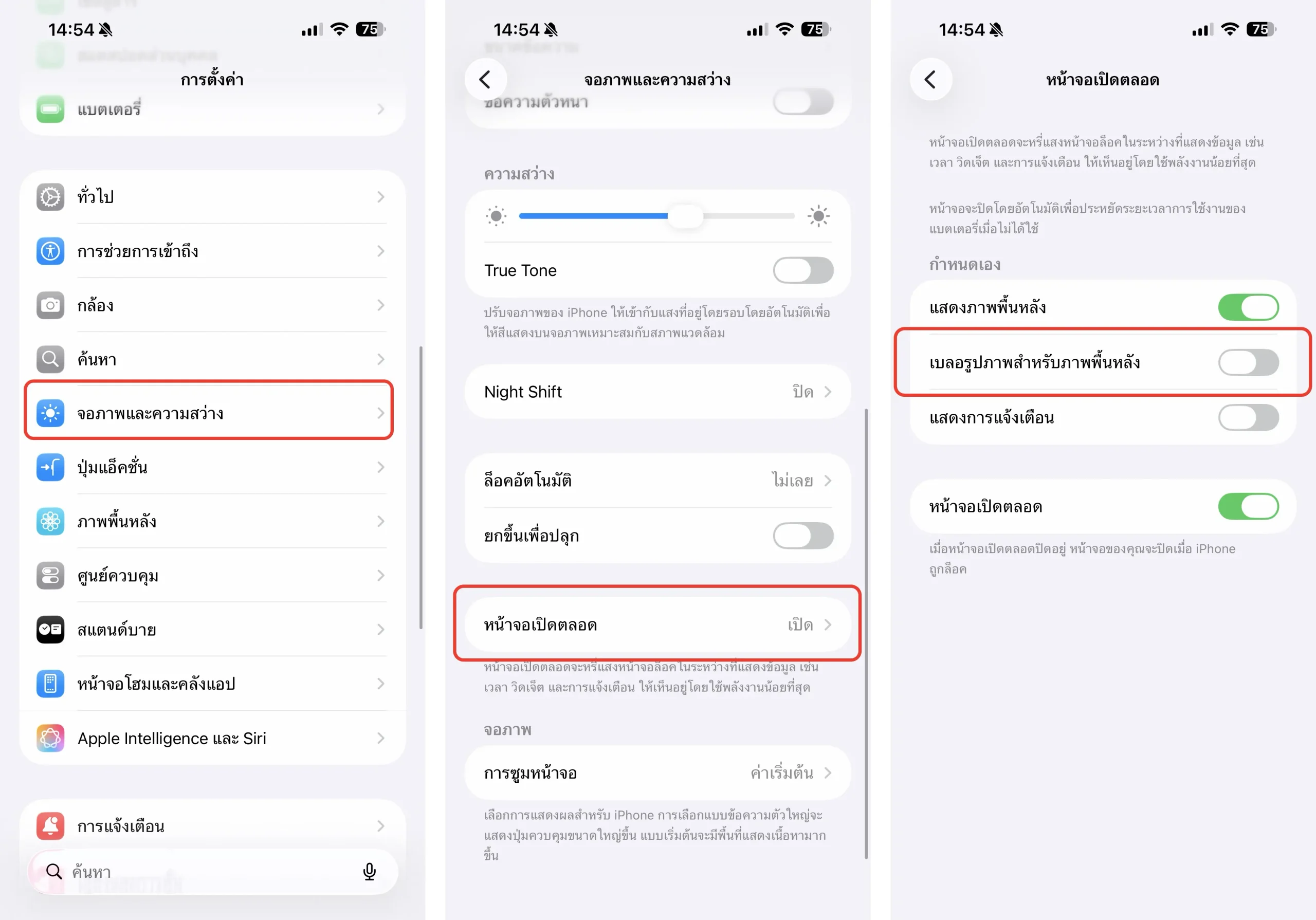 ไปที่ การตั้งค่า (Settings) > จอภาพและความสว่าง (Display & Brightness) > หน้าจอเปิดตลอด (Always on Display) > เลื่อนปิด เบลอรูปภาพสำหรับภาพพื้นหลัง (Blur Wallpaper Photo)