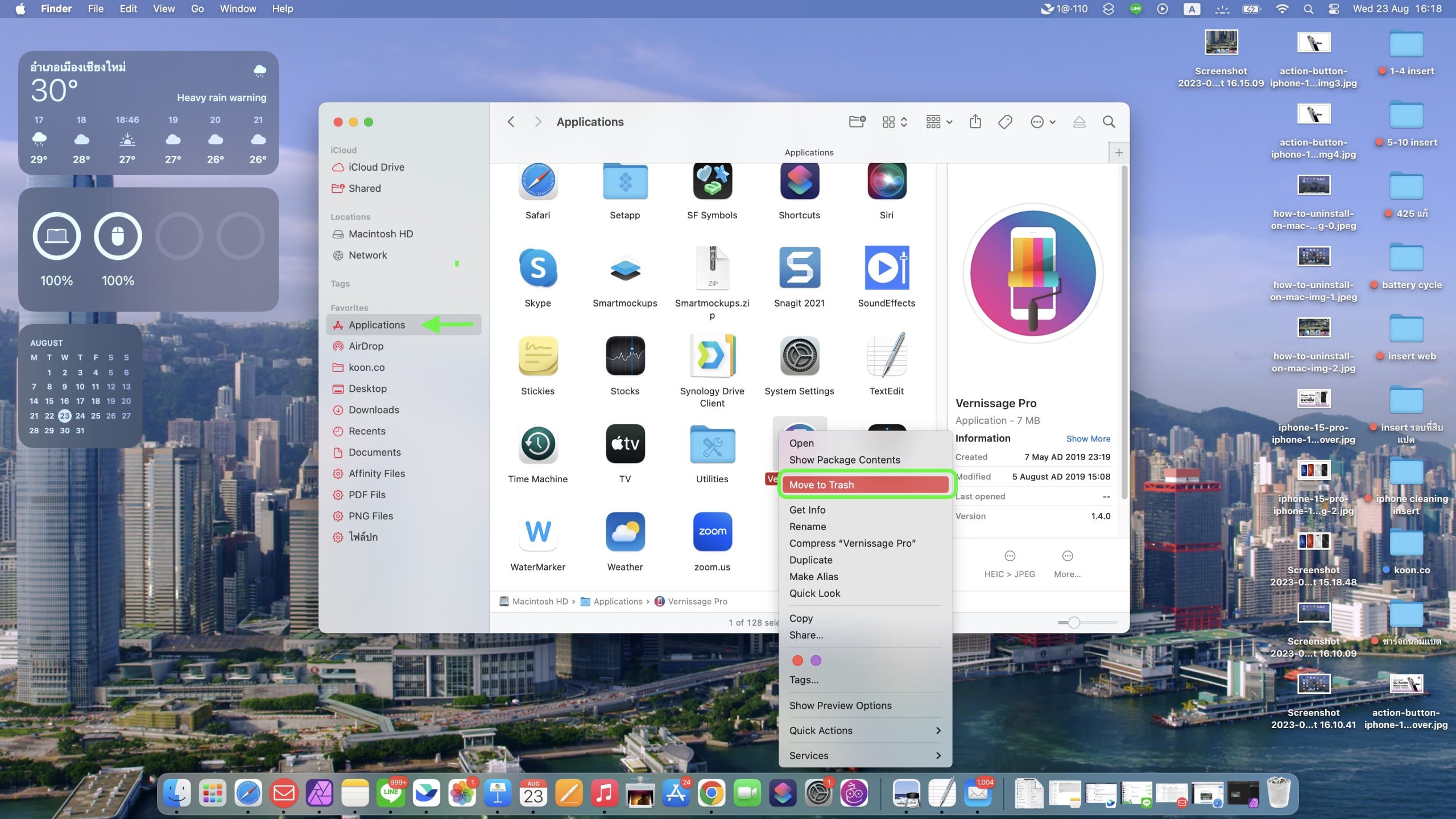 เปิด Finder ขึ้นมา > ไปที่เมนู Applications ที่อยู่บน sidebar > คลิกขวาที่แอปที่ต้องการจะลบ > กด Move to trash ได้เลย