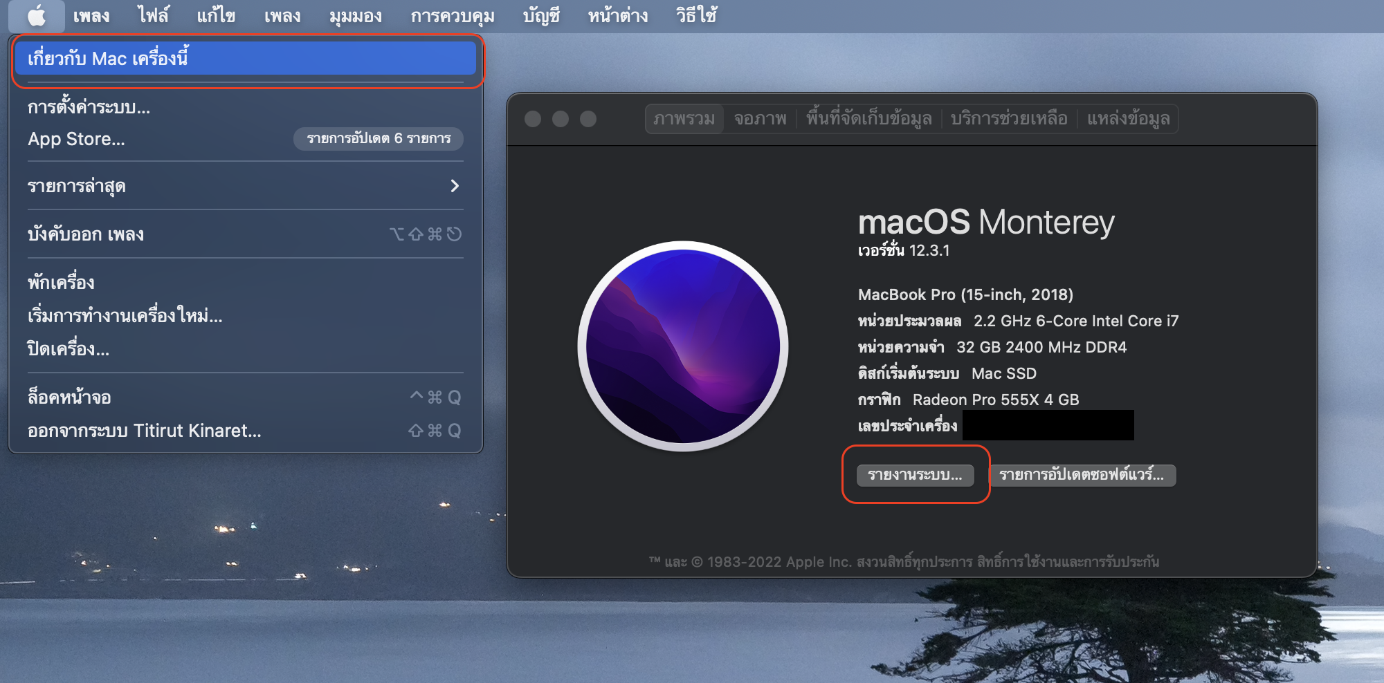 เชื่อมต่อจอ Studio Display เข้ากับ Mac แล้ว คลิกเมนู Apple บนซ้ายของจอ > คลิก “เกี่ยวกับ Mac เครื่องนี้” > คลิก “รายงานระบบ”