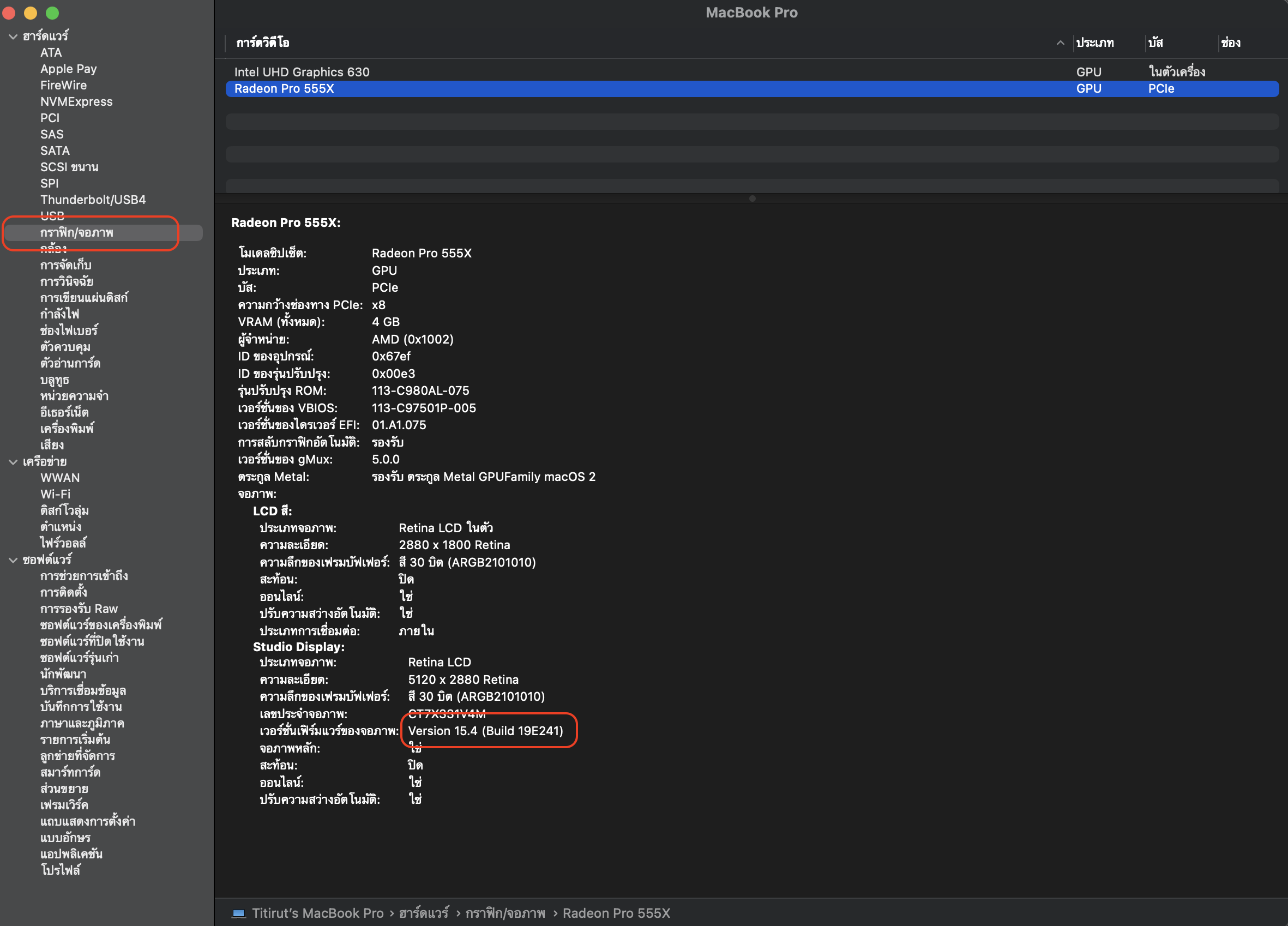 คลิก “กราฟิก/จอแสดงผล” > เลือก GPU ด้านบน > เวอร์ชัน Firmware จะแสดงในหัวข้อ Studio Display