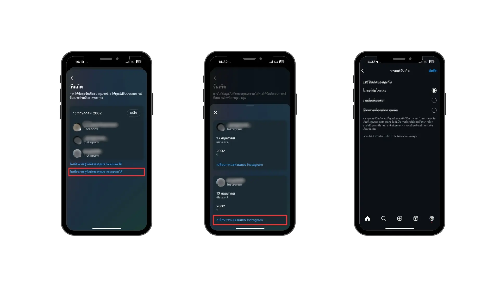 5. นอกจากนี้ ยังสามารถตั้งค่าให้ใครสามารถเห็นวันเกิดของเราบน Instagram อัปเดตการแชร์วันเกิดเป็นไม่แชร์กับใครเลย รายชื่อเพื่อนสนิท หรือผู้ติดตามที่คุณติดตามกลับ