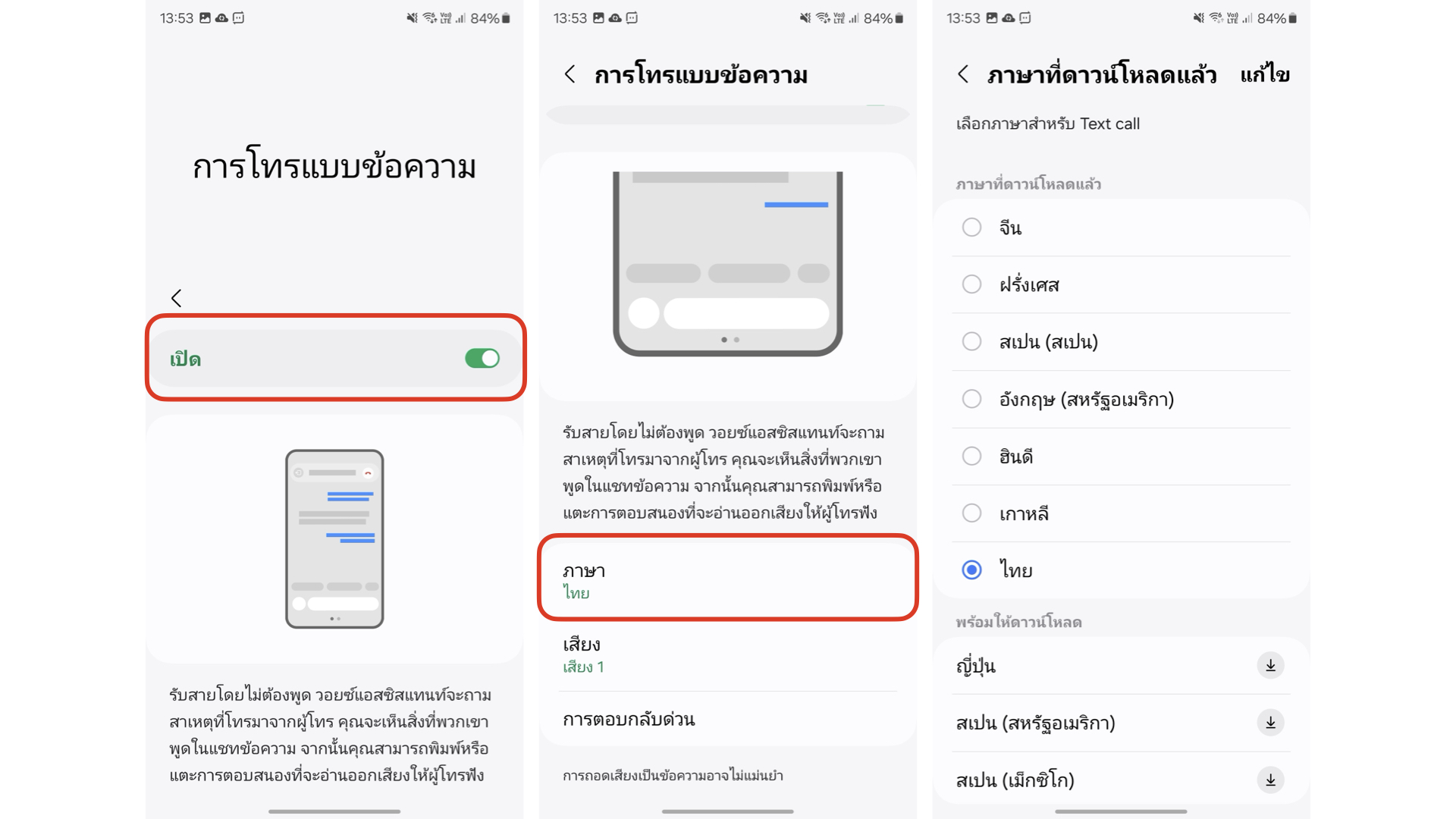 - การโทรแบบข้อความ > เลื่อนเปิด > เลือกภาษาท่ีเราพูด (หรือกดดาวน์โหลดเพิ่ม) > เลือกเสียงพูด และปรับความเร็วในการพูด