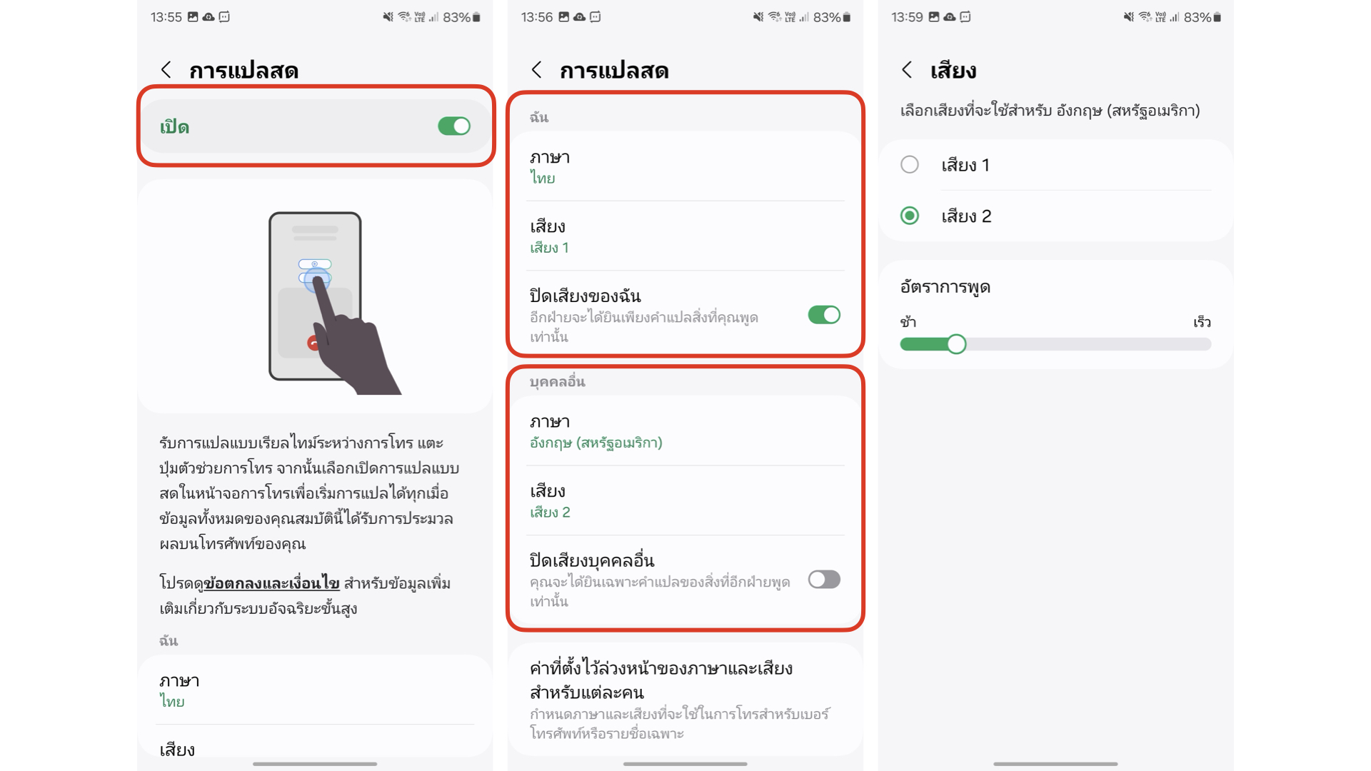 - การแปลสด > เลื่อนเปิด > เลือกภาษาท่ีพูด (หรือกดดาวน์โหลดเพิ่ม) > เลือกเสียงพูด และปรับความเร็วในการพูด > ตัวเลือกปิดเสียง เป็นการปิดเสียงคนพูด แล้วอีกฝ่ายจะได้ยินเพียงคำแปลของ AI โดยภาษาของบุคคลอื่นให้ตั้งค่าวิธีเดียวกันเลย