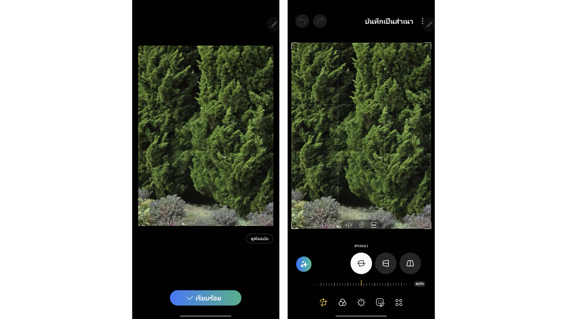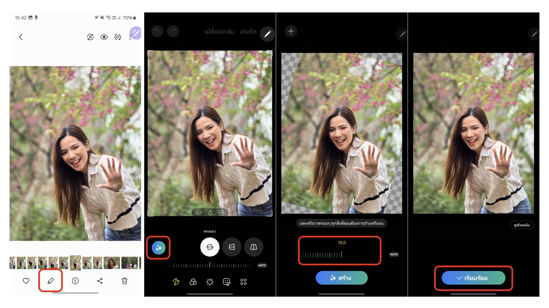 - Generative Fill : ใช้ในกรณีต้องการเติมเต็มภาพ, ปรับองศา, ขยายภาพให้ดูกว้างขึ้น วิธีการเหมือนเดิมเมื่อเลือกไอคอน AI แล้ว > หมุนภาพแถบด้านล่างตามต้องการ > แตะ “สร้าง” > รอ AI ประมวลผล > แตะ “เรียบร้อย” > บันทึกสำเนา