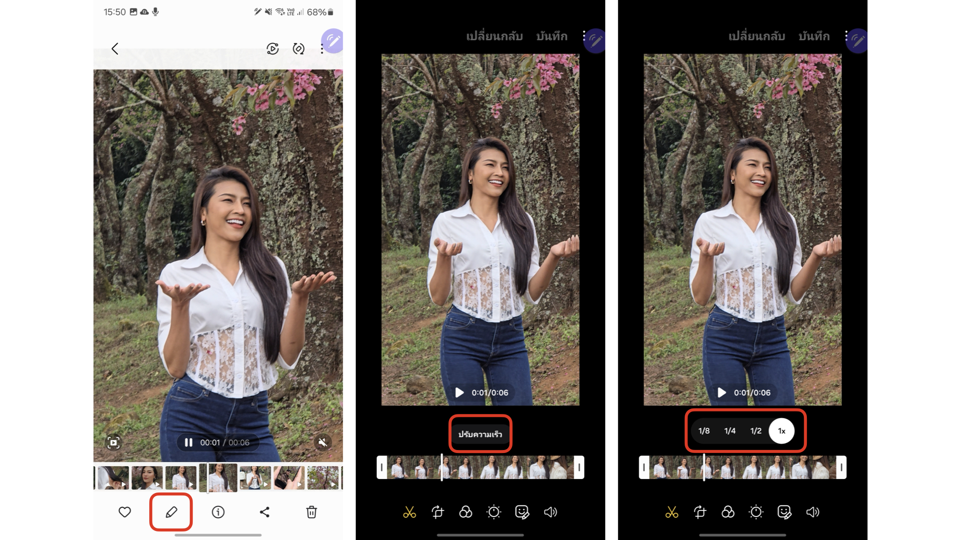 เป็นฟีเจอร์ที่เพิ่มเข้ามาใหม่ใน Galaxy S24 Ultra ก็คือโหมดสโลว์โมชัน ทำได้เพียงแค่ใช้นิ้วแตะหน้าจอบนวิดีโอที่ดูพรีวิว > กดแก้ไข > เลือกความเร็ว + ระยะที่ต้องการทำโหมดสโลว์ > รอ AI ประมวลผล > บันทึกสำเนา เพียงเท่านี้ก็ได้วิดีโอสไลว์ในช่วงที่ต้องการแบบไม่ต้องย้ายไปตัดต่อแอปอื่นแล้ว