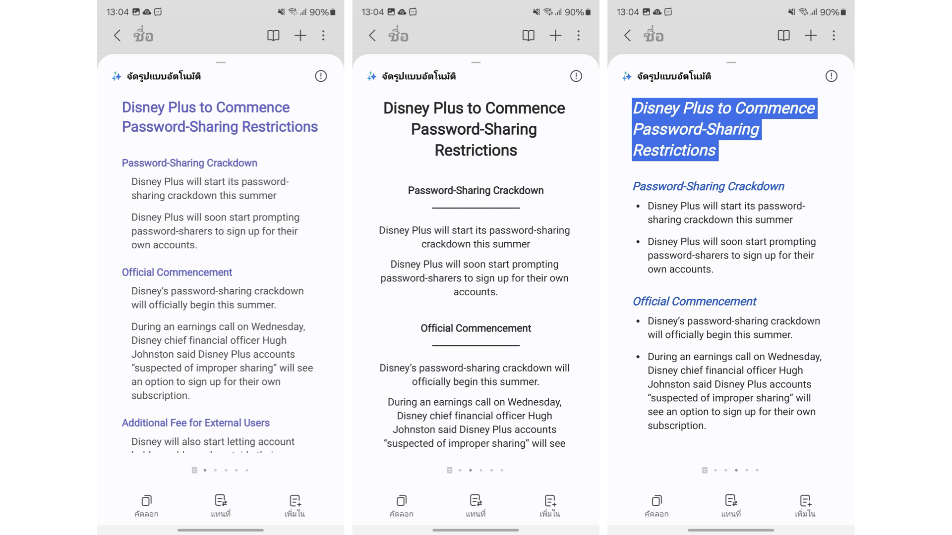 - สรุป (Sammarize) : ตัวช่วยสรุปใจความสำคัญของบทความ เลคเชอร์ หรือบันทึกการประชุมที่เพิ่มในแอปโน้ต โดย AI จะสรุปให้เป็นหัวข้อย่อย เลือกได้ทั้งการสรุปแบบมาตรฐาน และแบบละเอียด