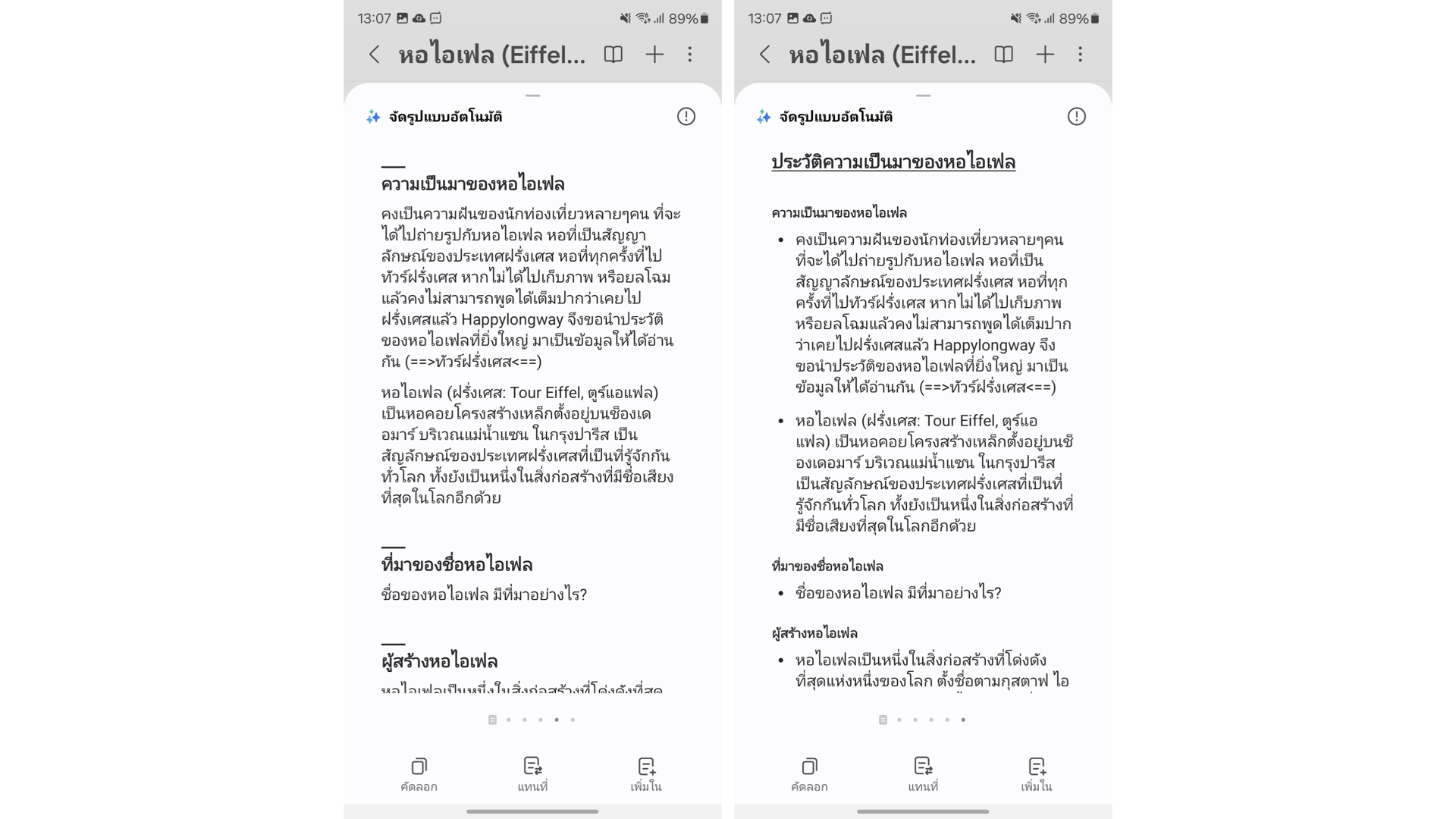 นอกจากนี้ยังสามารถใช้ฟีเจอร์สรุปใจความสำคัญบนเว็บไซต์ที่เข้าค้นหาข้อมูลได้ วิธีการคือ ไปที่หน้าเว็บไซต์ > แตะปุ่มดาว AI ด้านล่าง > สรุป > เว็บไซต์จะสรุปใจความสำคัญของเนื้อหานั้น และสามารถกดแปลภาษาต่อได้