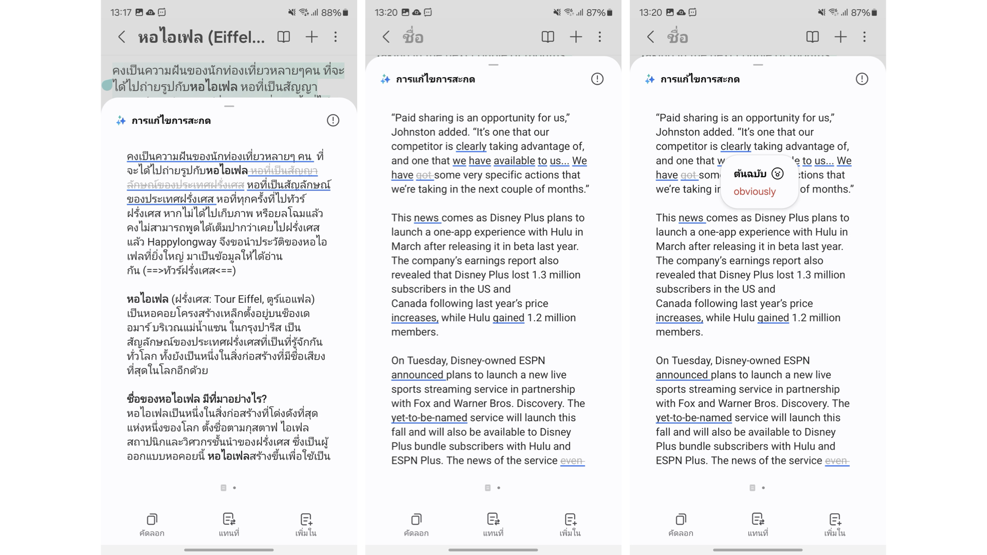 - การแก้ไขการสะกด (Correct spelling) : ช่วยตรวจเช็คคำที่สะกดผิดให้ในภาษาไทย ส่วนภาษาอังกฤษจะเป็นการตรวจเช็ค Grammar พร้อมแนะนำคำศัพท์ที่มีความหมายใกล้กันให้
