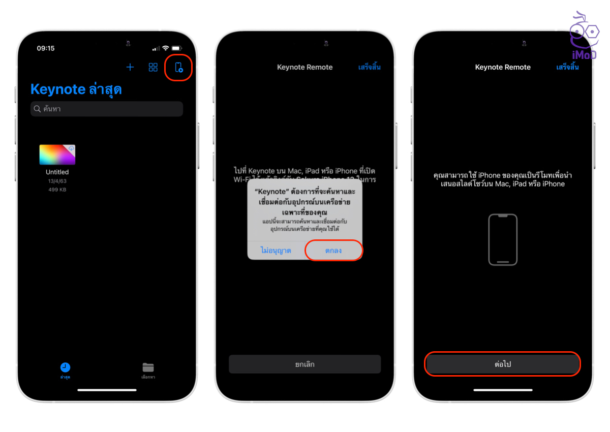 iPhone และ Mac จะต้องเชื่อมต่อ Wi-Fi เดียวกันไว้ทั้งคู่ เปิดแอป Keynote บน iPhone > แตะไอคอนรีโมทด้านบนขวา > อนุญาตการเชื่อมต่อ แตะตกลง > แตะต่อไป