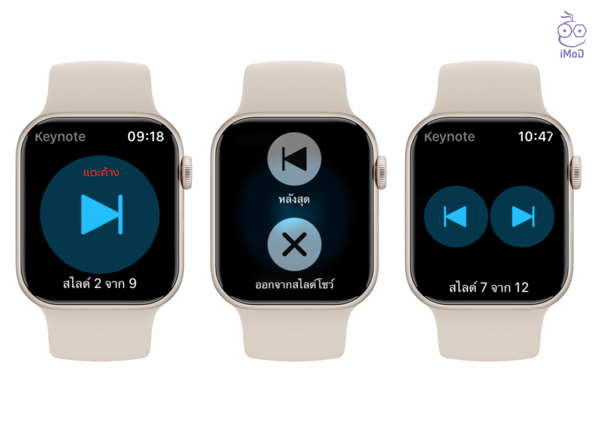 สำหรับการควบคุมบน Apple Watch ให้เข้าแอป Keynote > แตะปุ่มเล่นสีเขียว เพื่อเริ่มสไลด์ได้เช่นกัน > แตะปุ่มถัดไป หากต้องการไปยังสไลด์ถัดไป ระหว่างนำเสนอ