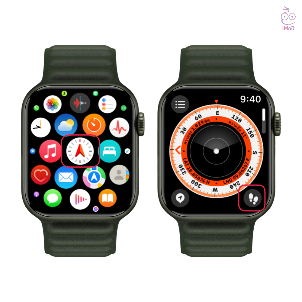วิธีใช้ก็ง่าย ๆ เลย เพียงแค่เปิดแอปเข็มทิศ (Compass) บน Apple Watch > แตะไอคอนรูปเท้า ด้านล่างขวา