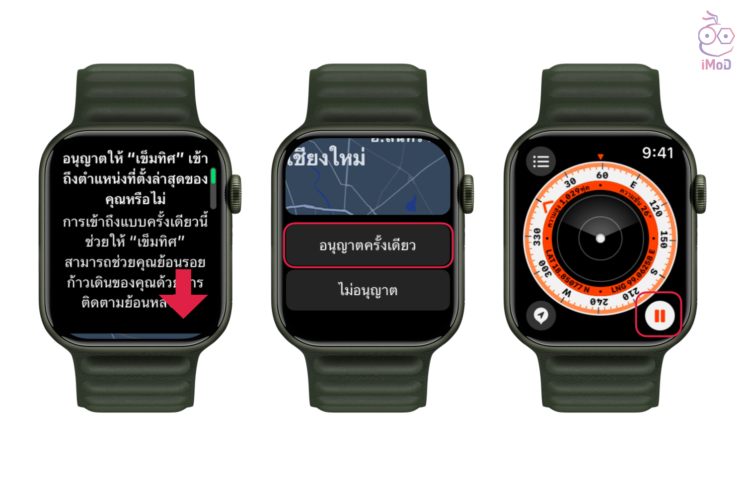 อนุญาตให้ “เข็มทิศ” เข้าถึงตำแหน่งที่ตั้ง โดยเลื่อนลงด้านล้าง แล้วแตะ อนุญาตครั้งเดียว (Allow Once) > จากนั้นก็เดินไปตามทางที่ต้องการได้เลย เมื่อต้องการเดินกลับทางเดิน ให้แตะ ไอคอนหยุดพัก (Pause) ด้านล่างขวา