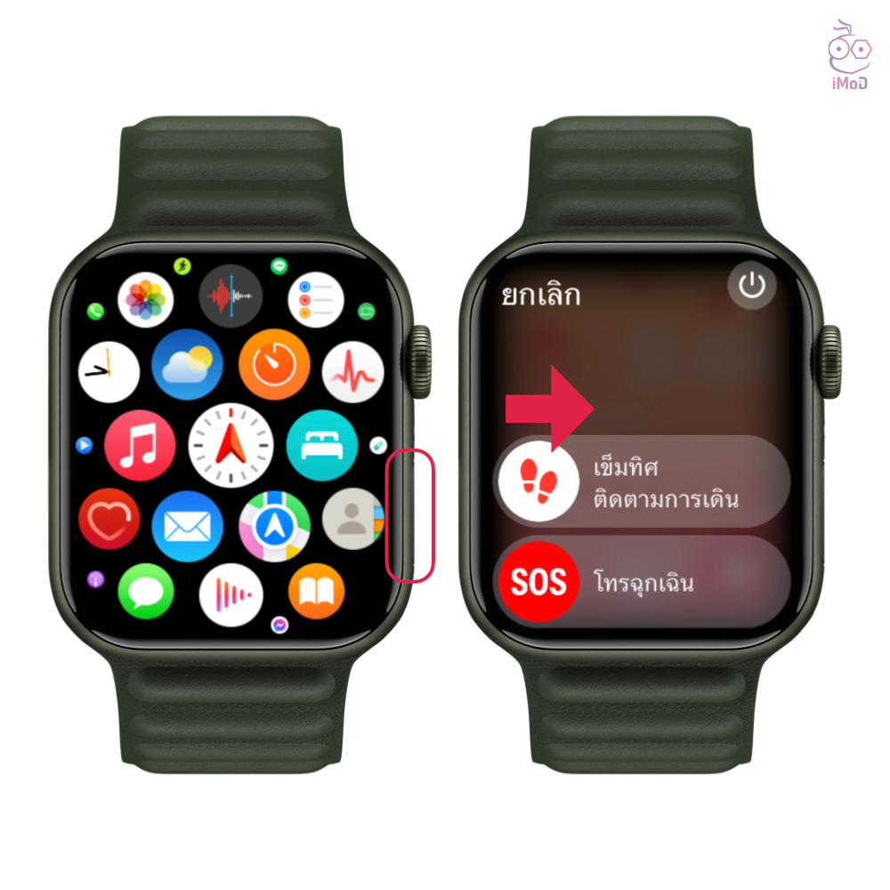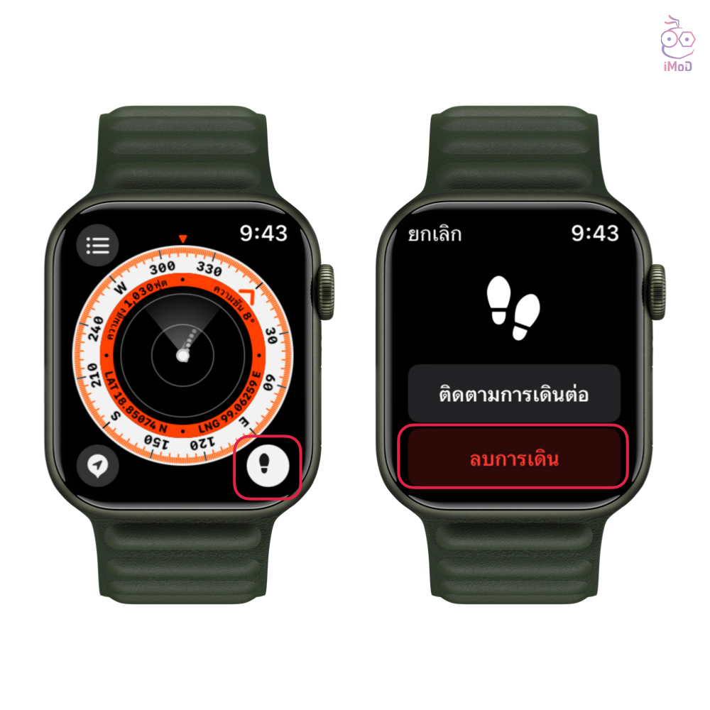 นอกจากนี้ เรายังสามารถเข้าถึงการติดตามการเดินด้วยเข็มทิศง่าย ๆ ด้วยการแตะปุ่มด้านข้าง (Power) ค้างไว้ > เลื่อน เข็มทิศติดตามการเดิน ไปทางขวา > จากนั้นก็เริ่มติดตามการเดินตามวิธีด้านบนได้เลย