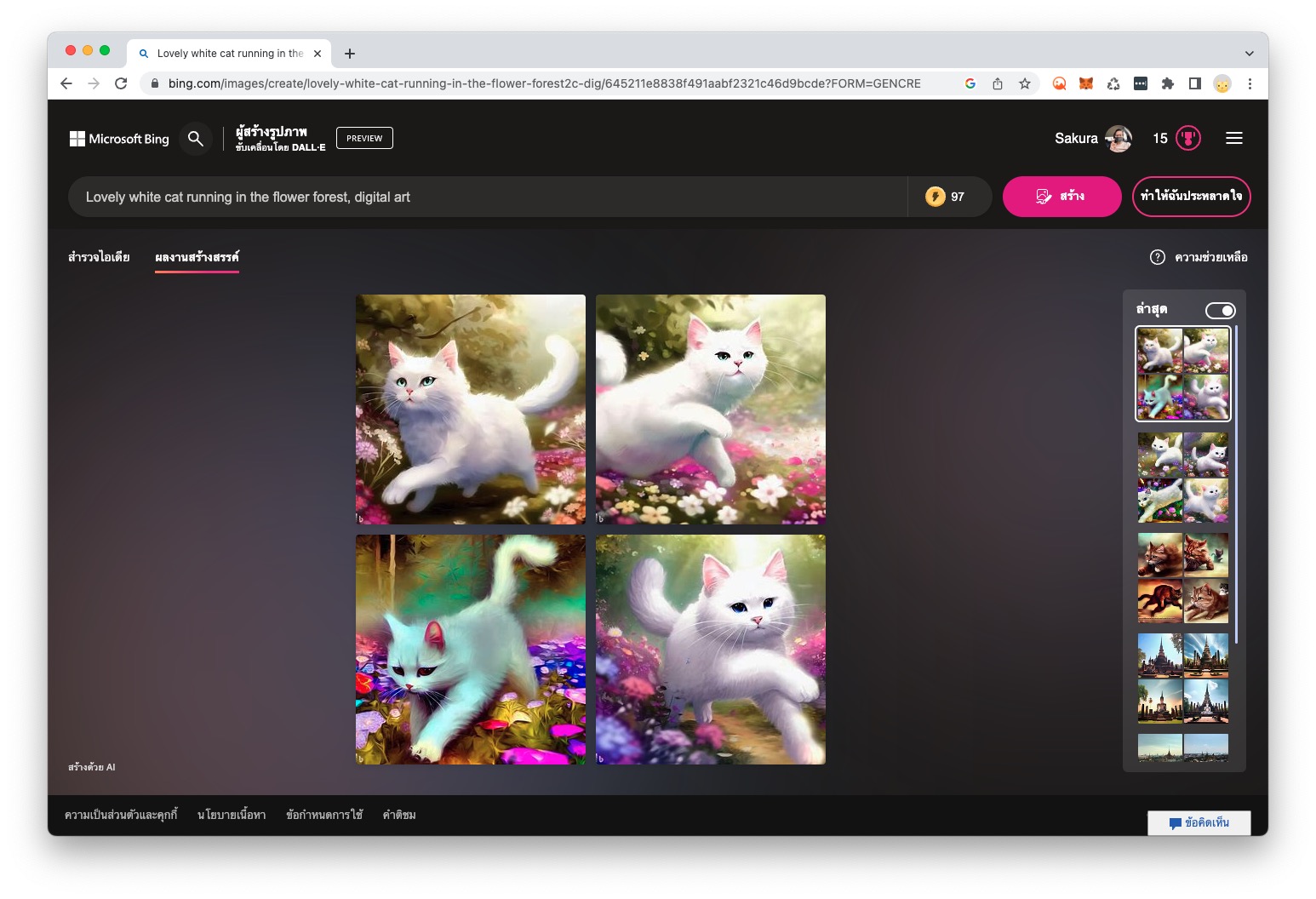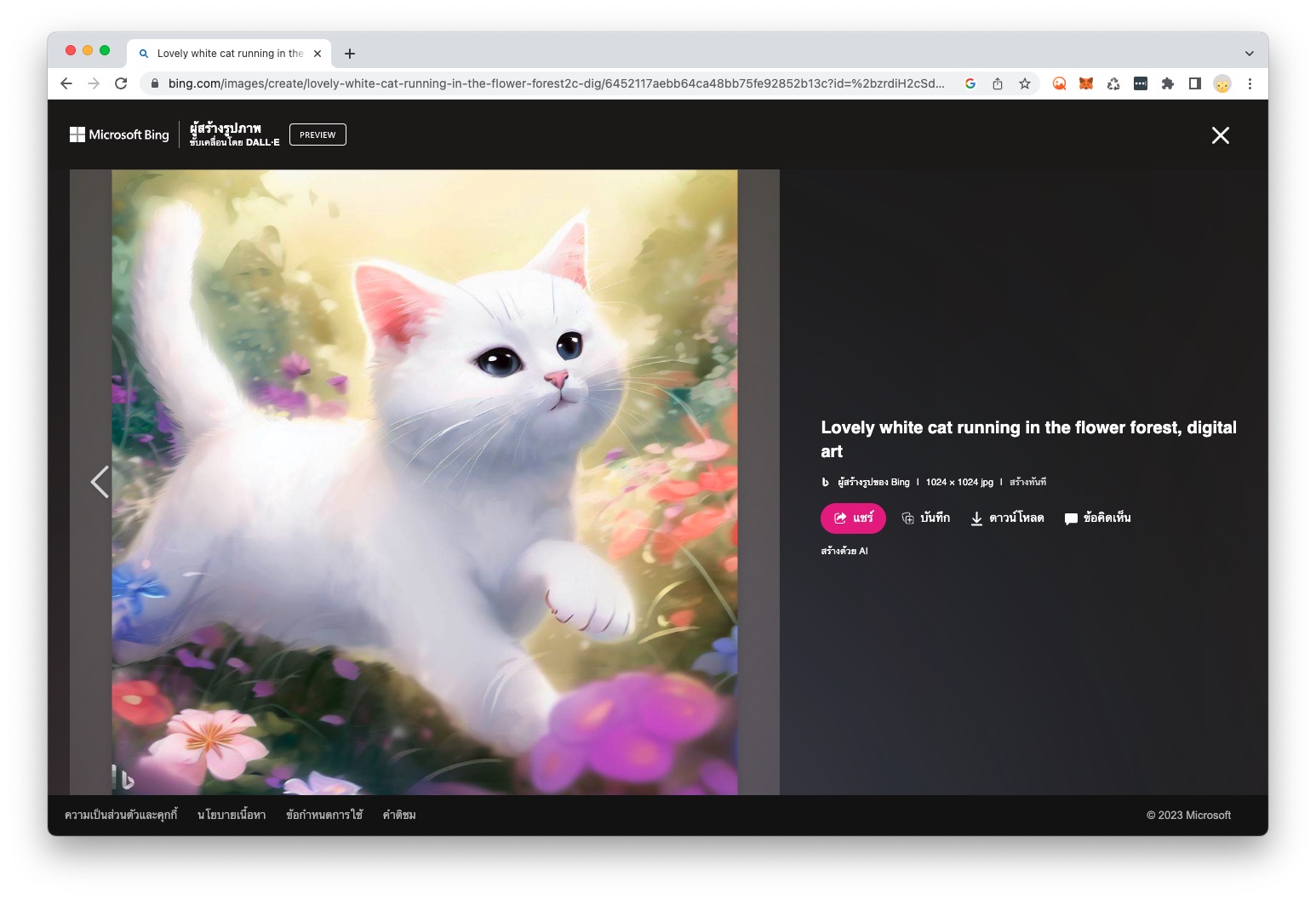 ตัวอย่างเช่น “Lovely white cat running in the flower forest, digital art” เราก็จะได้รูปภาพที่ถูก Generate ด้วย AI เป็นรูปภาพแมวสีขาวน่ารักกำลังวิ่งเล่นในสวนดอกไม้ เลือกบันทึกหรือแชร์รูปที่ตรงใจเรามากที่สุด