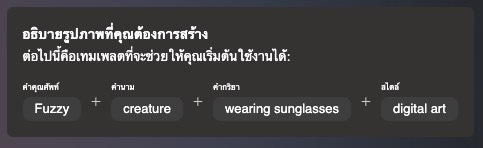 เทมเพลตที่จะช่วยให้เราเริ่มต้นสร้าง Prompts ได้ดีขึ้นคือ คำคุณศัพท์ + คำนาม + คำกิริยา + สไตล์ของรูปภาพ