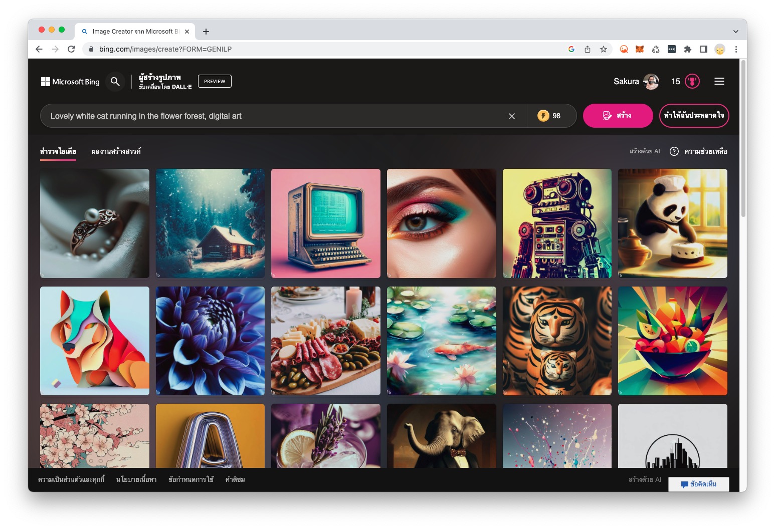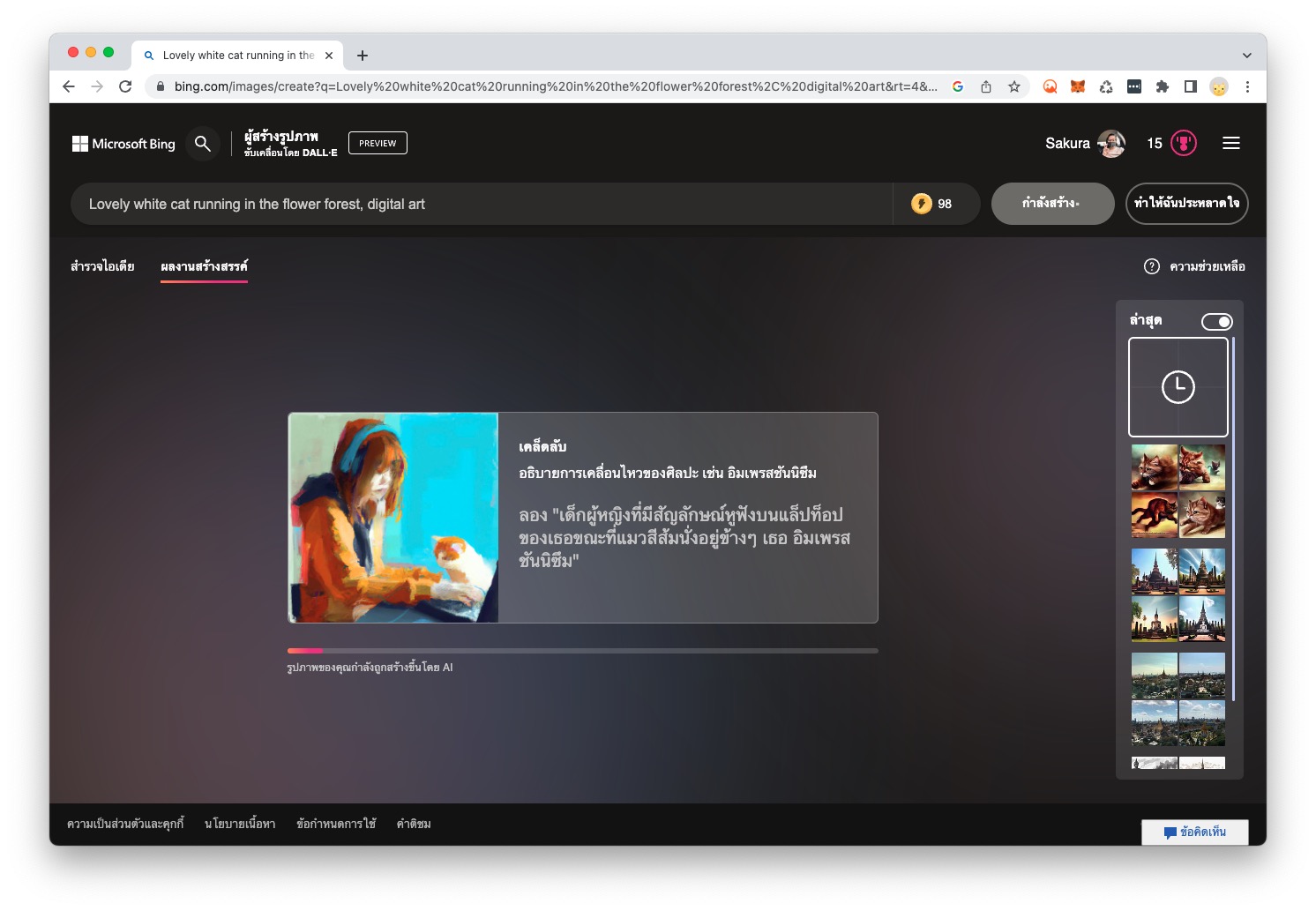 จากนั้นก็ป้อนข้อความหรือคำอธิบายที่เราต้องการให้เป็นรูปภาพ เหมือนเราจินตนาการรูปภาพไว้ในหัว เราก็ถ่ายทอดออกมาเป็นคำอธิบาย แล้วก็คลิก สร้าง ได้เลย จากนั้นก็รอให้ AI ประมวลผลสร้างรูปภาพสักครู่