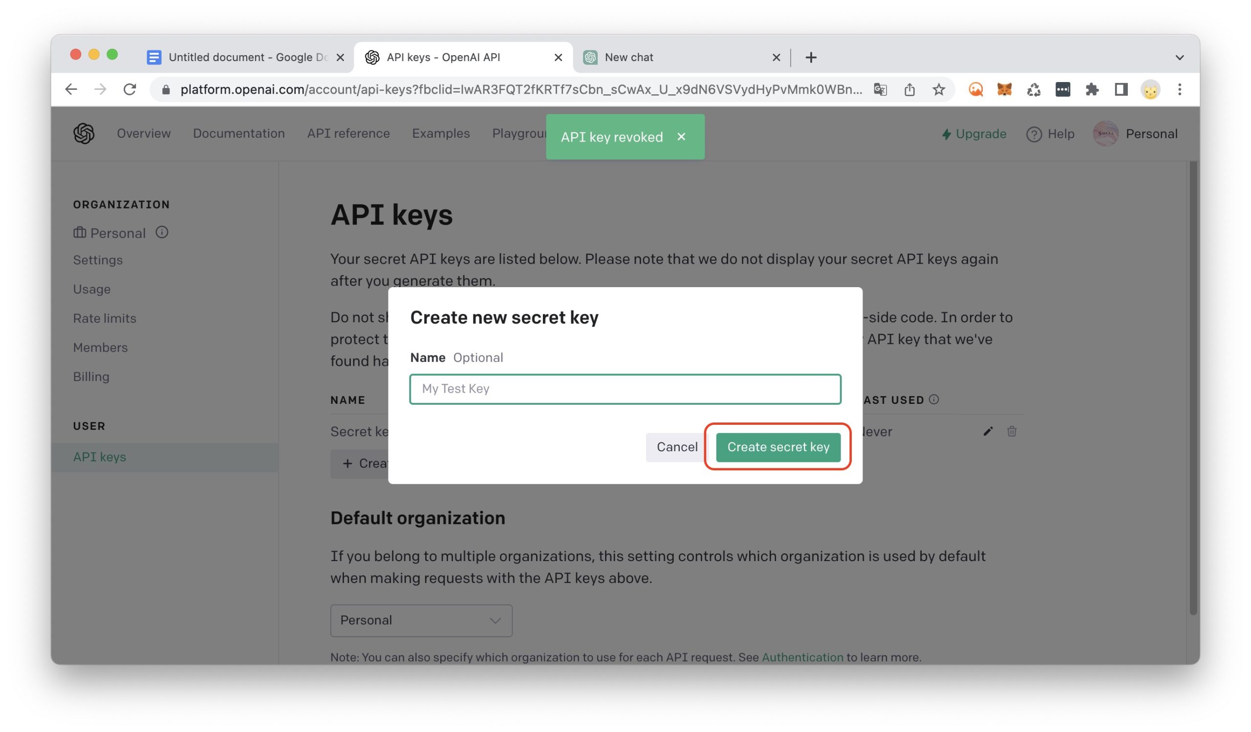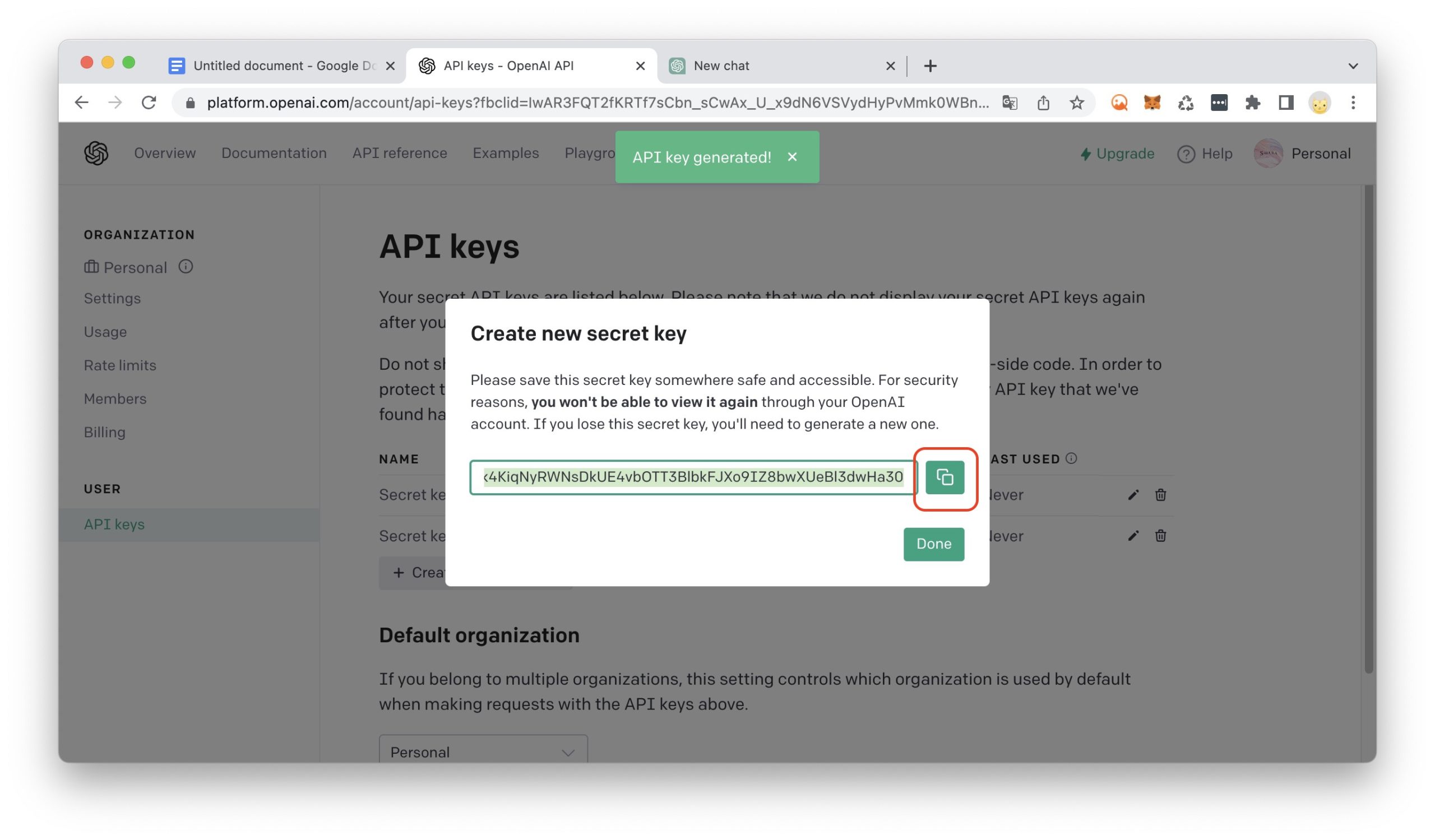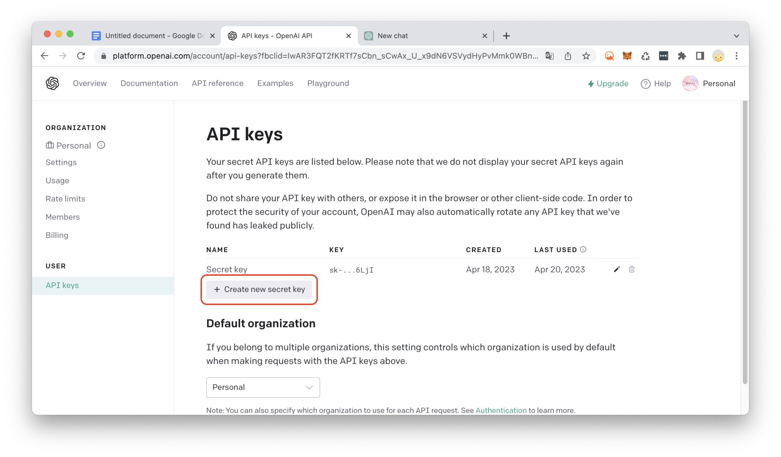 จากนั้น ให้เราไปที่เว็บไซต์ https://platform.openai.com/account/api-keys เพื่อขอ API keys ของ ChatGPT มาใช้งานในส่วนขยาย