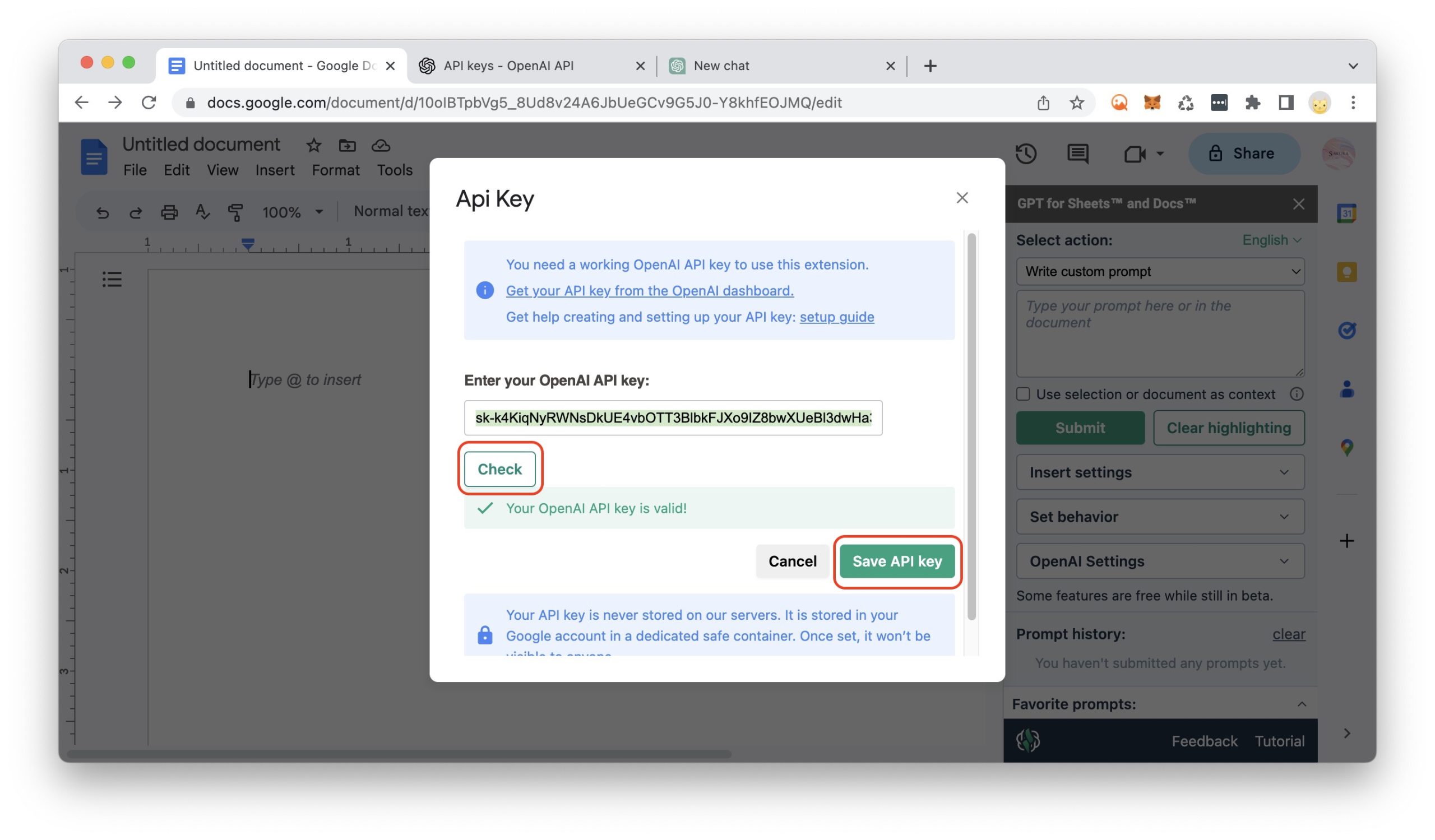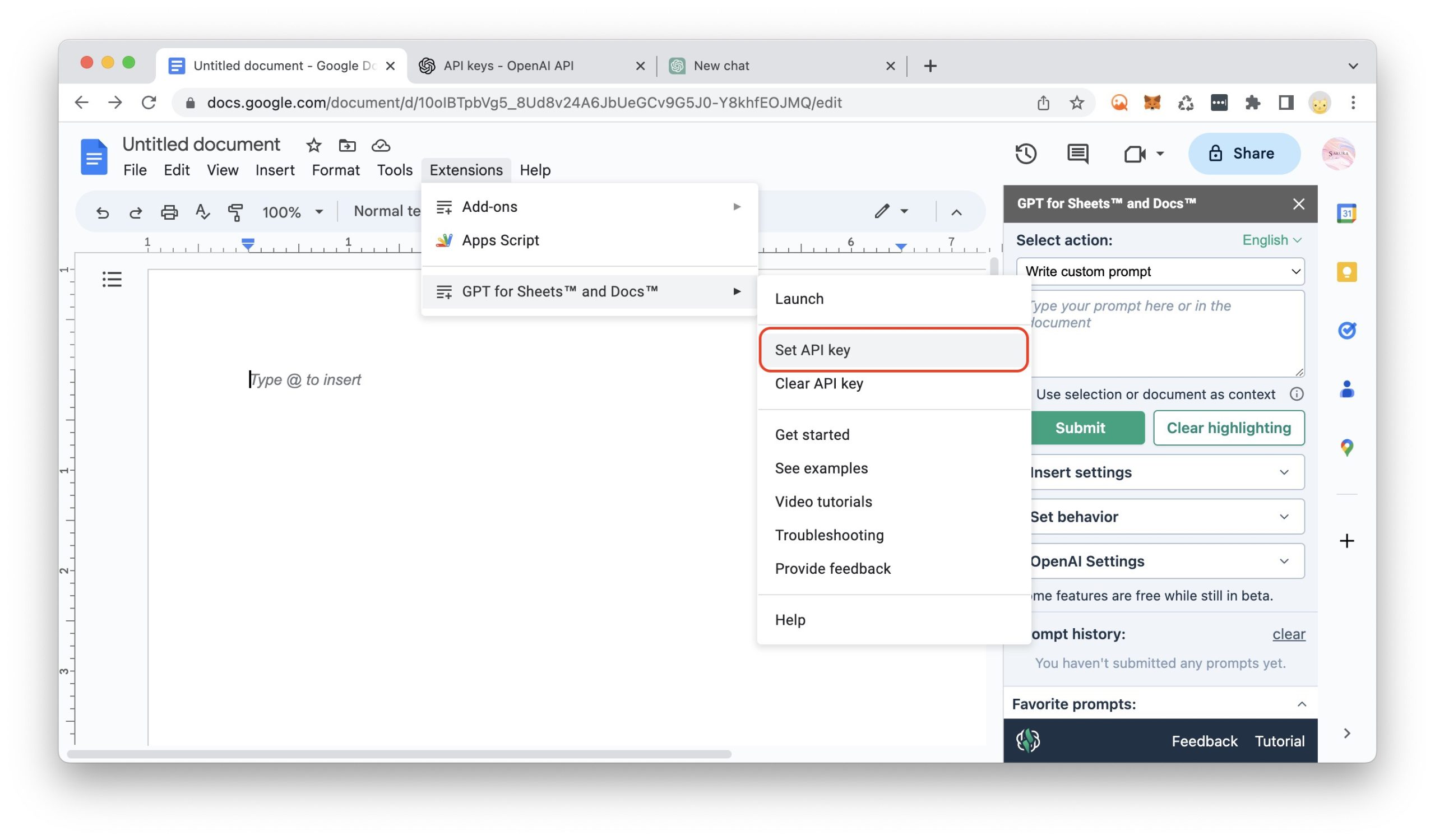 เมื่อได้ API Keys จาก ChatGPT มาแล้ว เราจะนำไปตั้งค่าใน Google Doc โดยกลับไปที่ Google Doc อีกครั้ง แล้วเลือกเมนู Extensions > GPT for Sheets and Doc > Set API Key