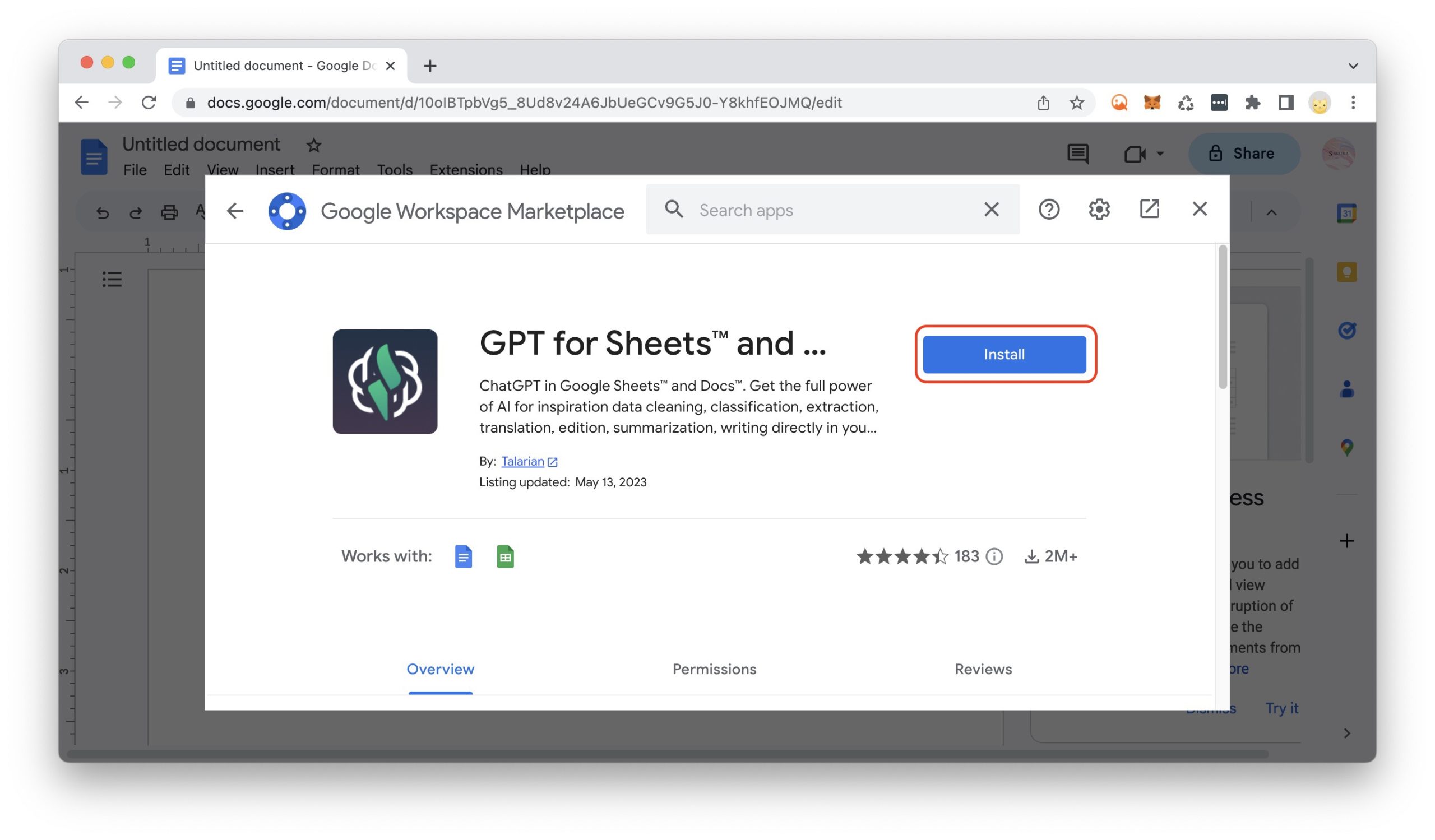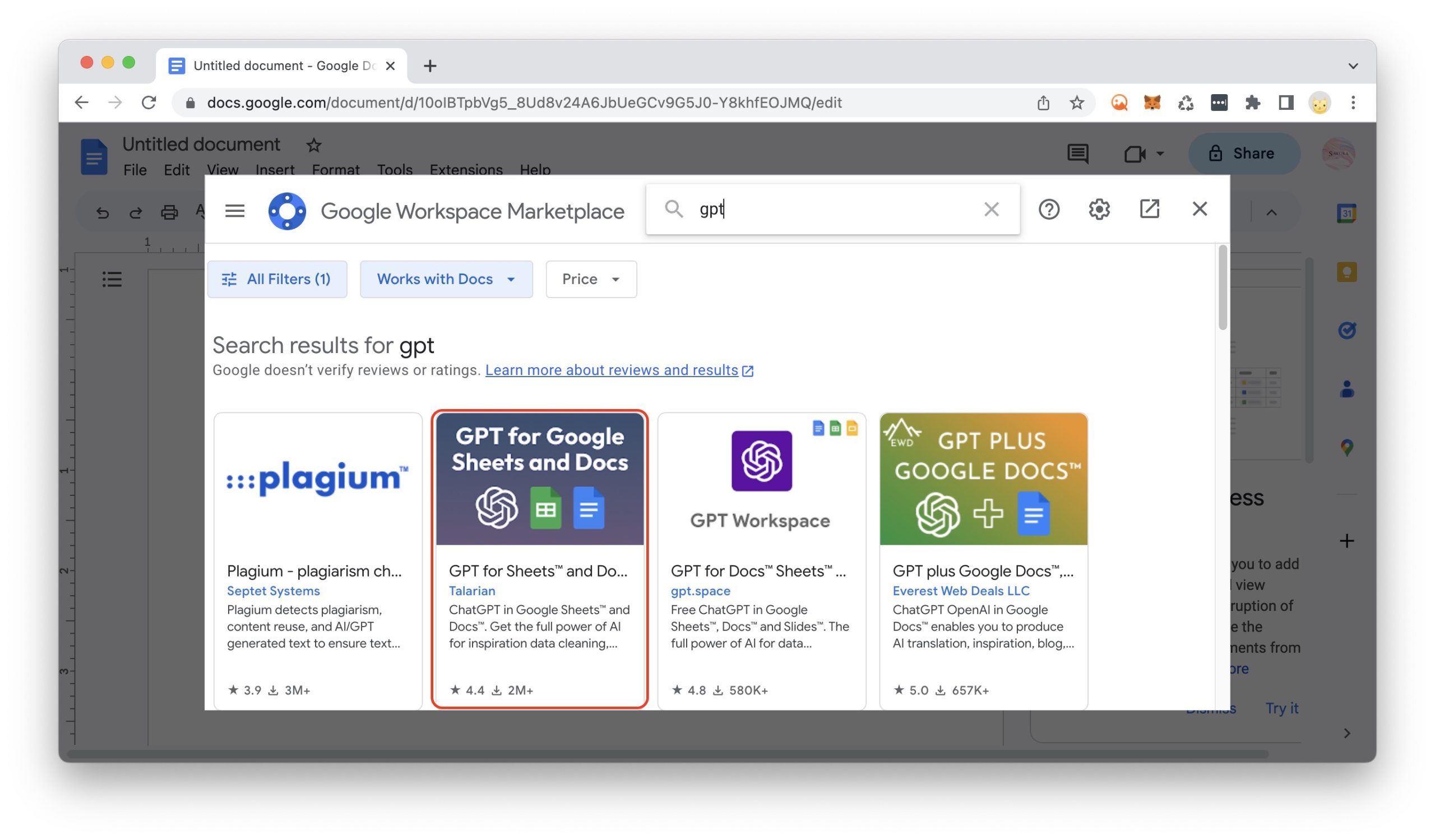 ค้นหาส่วนขยาย “gpt” จากนั้นก็เลือกส่วนขยาย GPT for Google Sheets and Docs