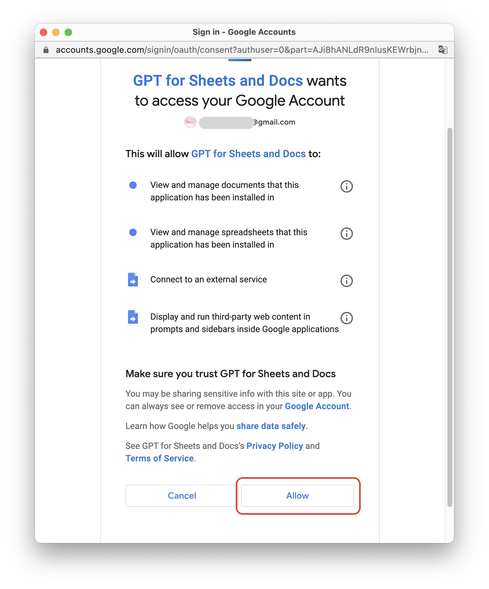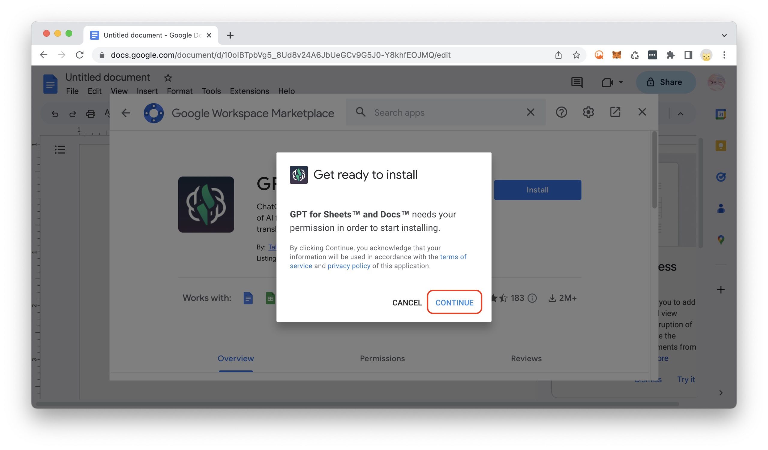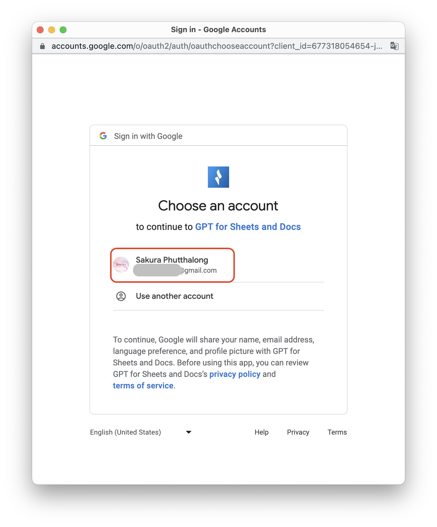 จากนั้นก็อนุญาตให้ส่วนขยายเข้าถึง Google Docs และ Google Sheet ด้วยการคลิก Continue