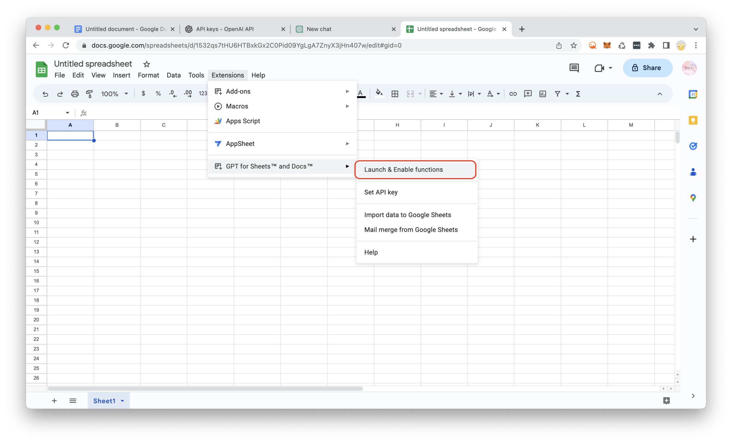 จากนั้นให้คลิกเมนู Extensions > GPT for Sheet and Doc > Launch & Enable Functions