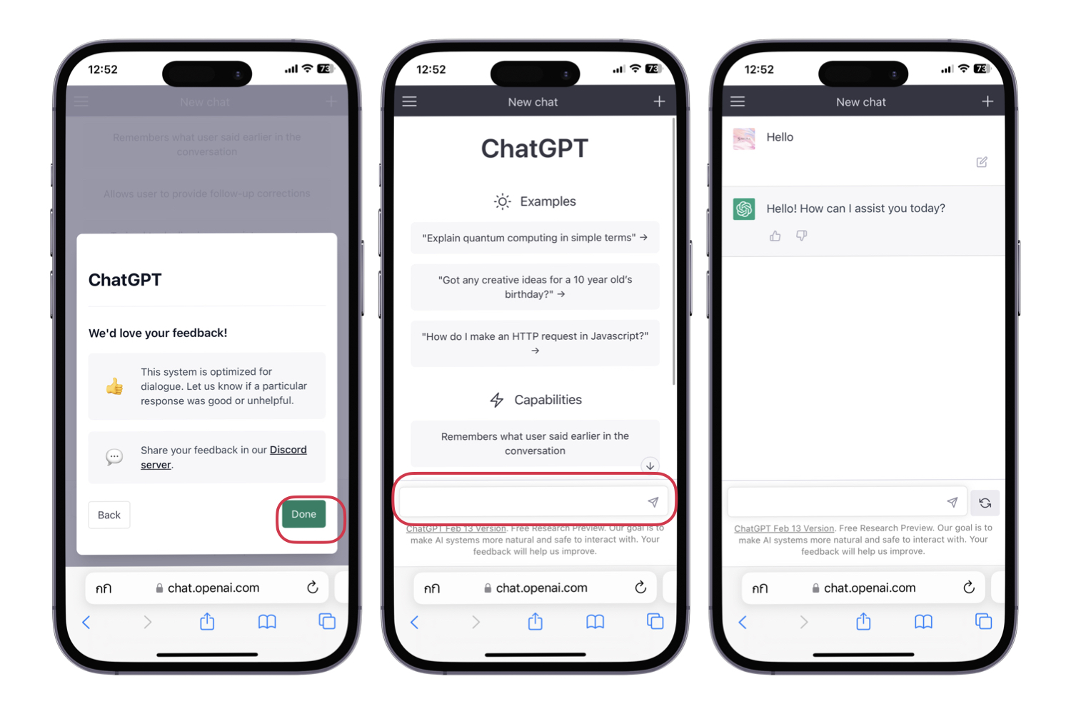 เมื่อลงทะเบียนเรียบร้อยแล้ว ก็ชมคำแนะนำและเริ่มใช้งานกันได้เลย เราจะพบกับคำแนะนำก่อนให้แตะ Next เรื่อย ๆ จนถึง Done > จากนั้นก็พิมพ์เรื่องที่อยากทราบเป็นภาษาอังกฤษ อาจจะเป็นเชิงคำถามหรือขอคำแนะนำจาก ChatGPT แล้วแตะไอคอนส่ง ตัวอย่างเริ่มต้นด้วยการทักทายก่อน