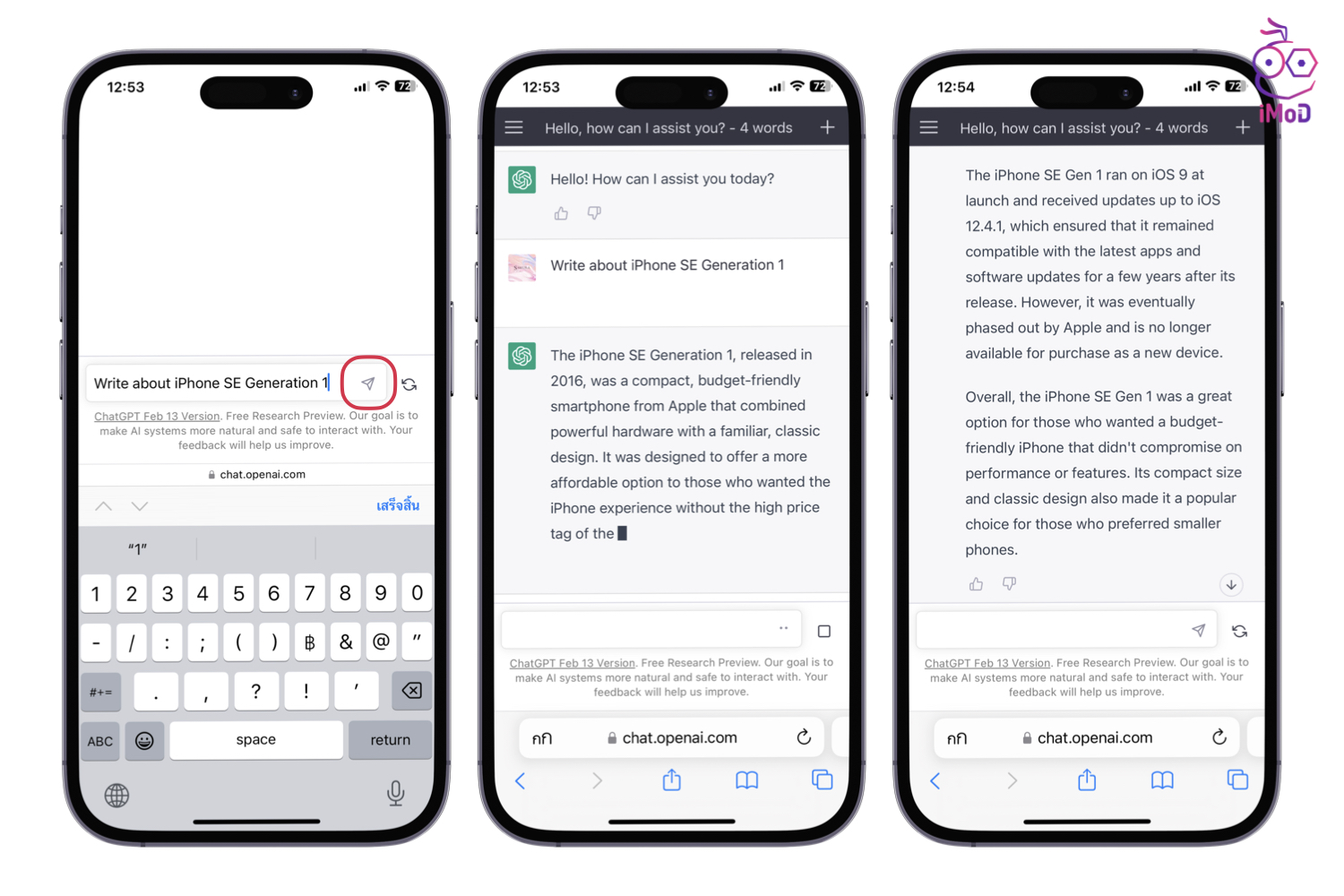 เราสามารถถามคำถาม หรือพิมพ์ข้อมูลที่เราอยากทราบ แล้วแตะไอคอน ส่ง เมื่อส่งข้อความไปแล้ว ChatGPT ก็จะเริ่มตอบกลับมาเป็นพารากราฟยาว ๆ ซึ่งให้ข้อมูลค่อนข้างละเอียด และอ่านเข้าใจง่าย