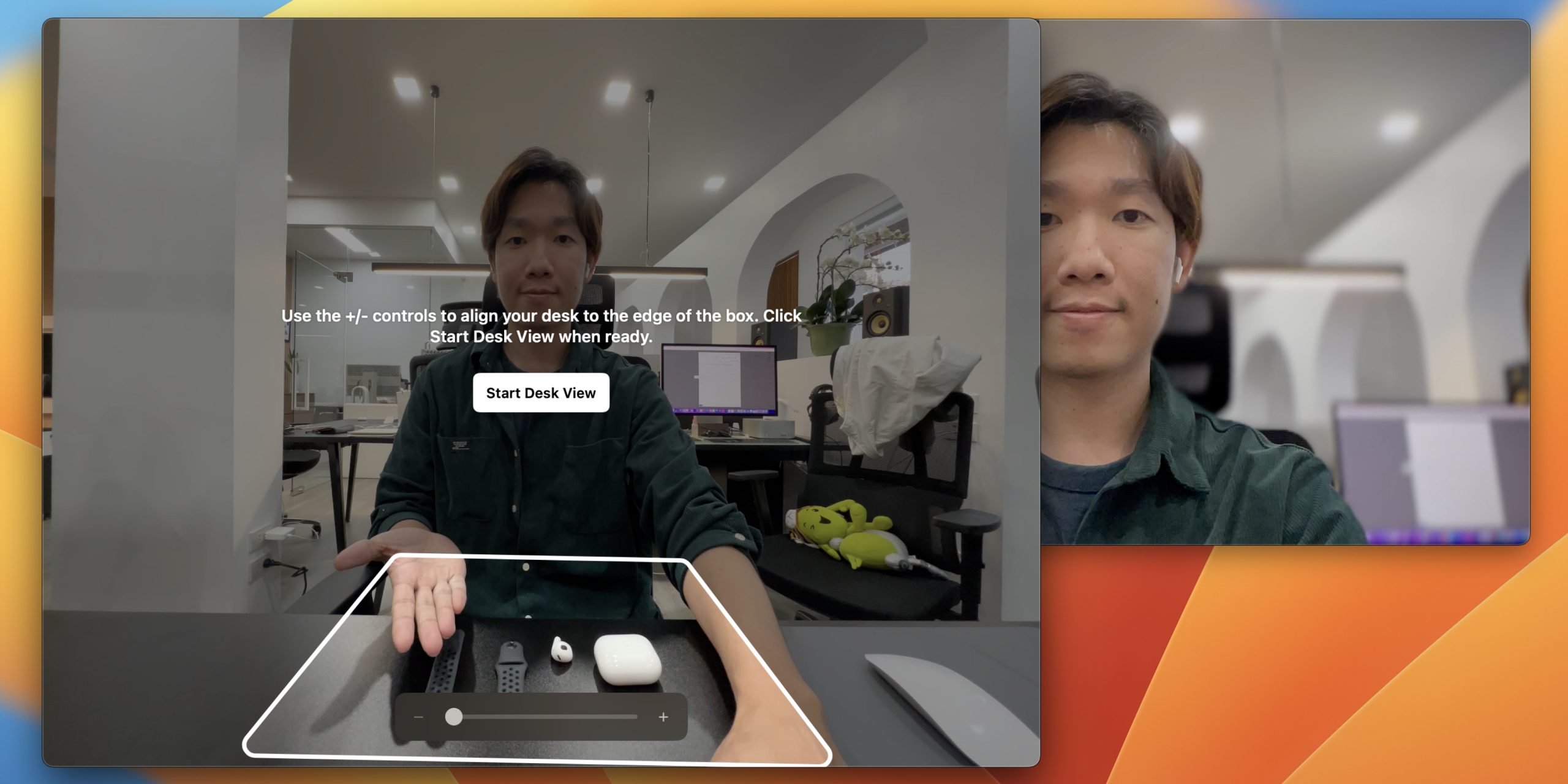 และอีกหนึ่งฟีเจอร์ใหม่ที่เข้ามาใน Continuity Camera นั่นก็คือ Desk View เป็นฟีเจอร์ที่เราสามารถแสดงมุมมองพื้นที่การทำงานบนโต๊ะของเราได้ตามชื่อ Desk View เลย