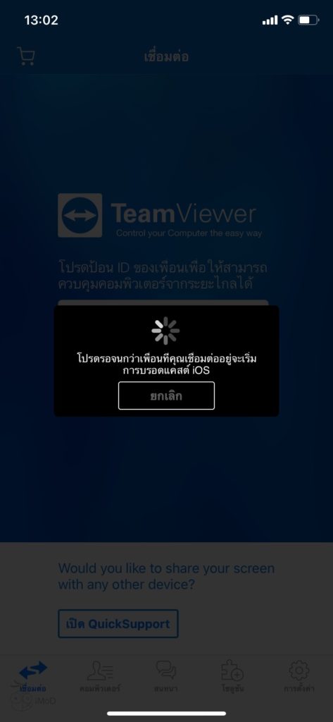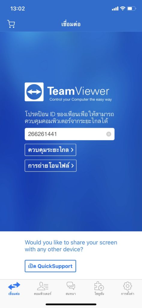 หากใครที่อยากจะใช้ iPhone แชร์หน้าจอก็เพียงแค่สลับมาเปิดแอป TeamViewer QuickSupport และให้อุปกรณ์ที่ต้องการรีโมทใช้แอป TeamViewer: Remote Control รีโมทผ่าน ID ดังวิธีด้านบน ลองทำกันดูนะคะ